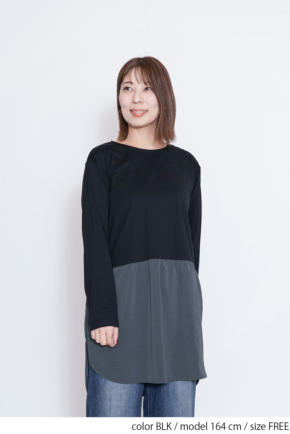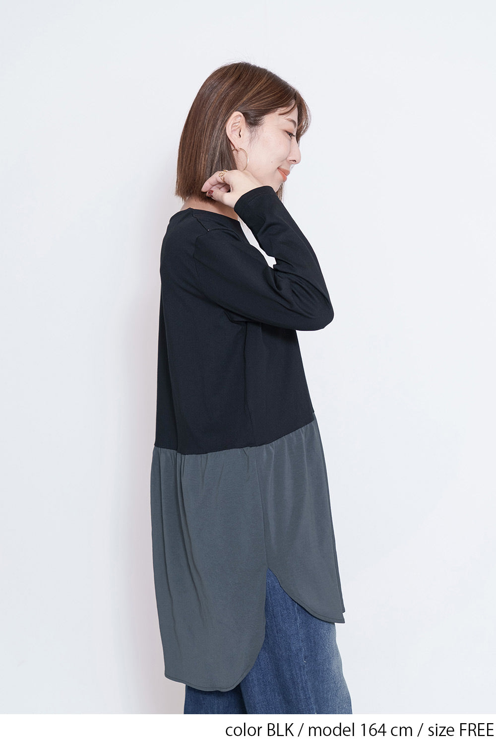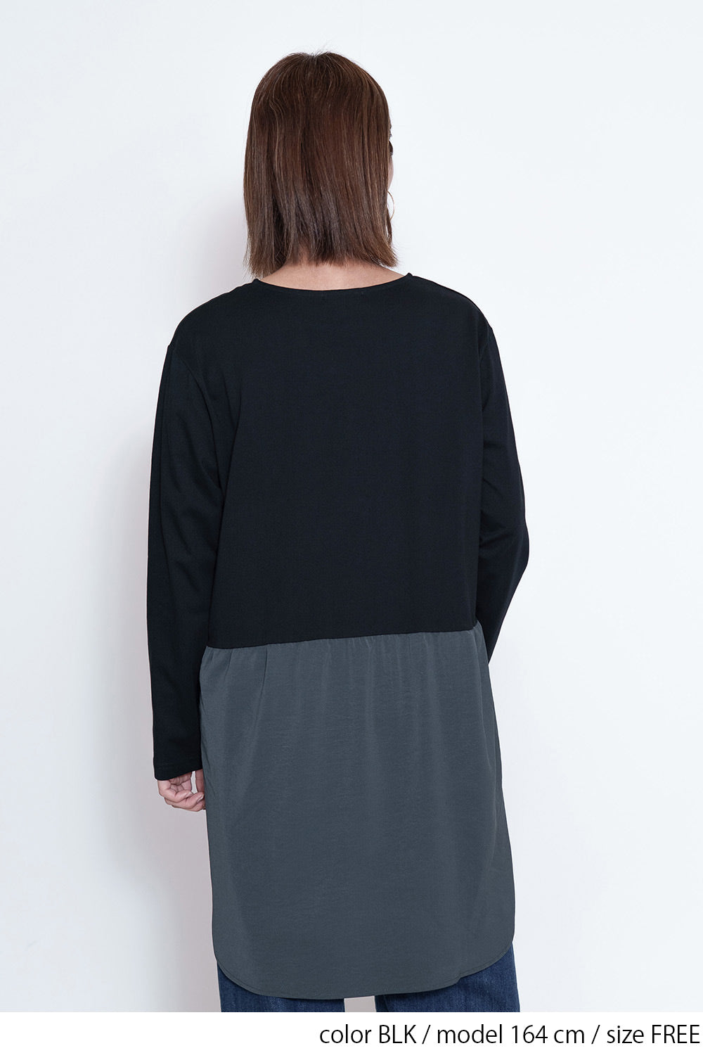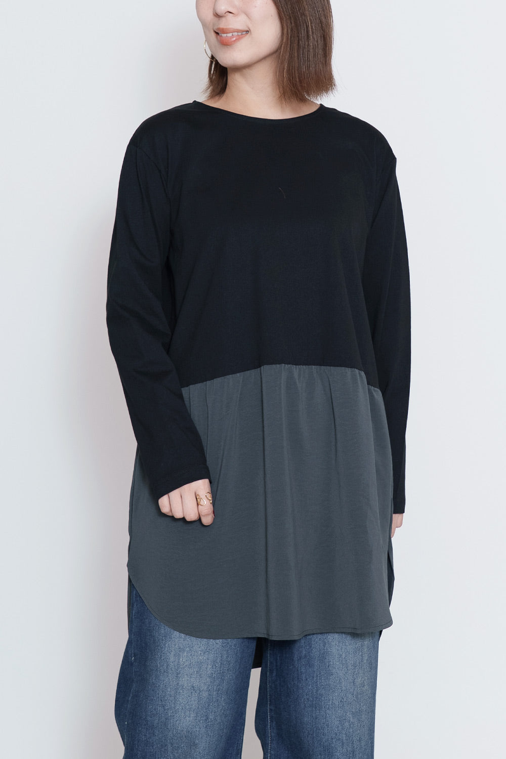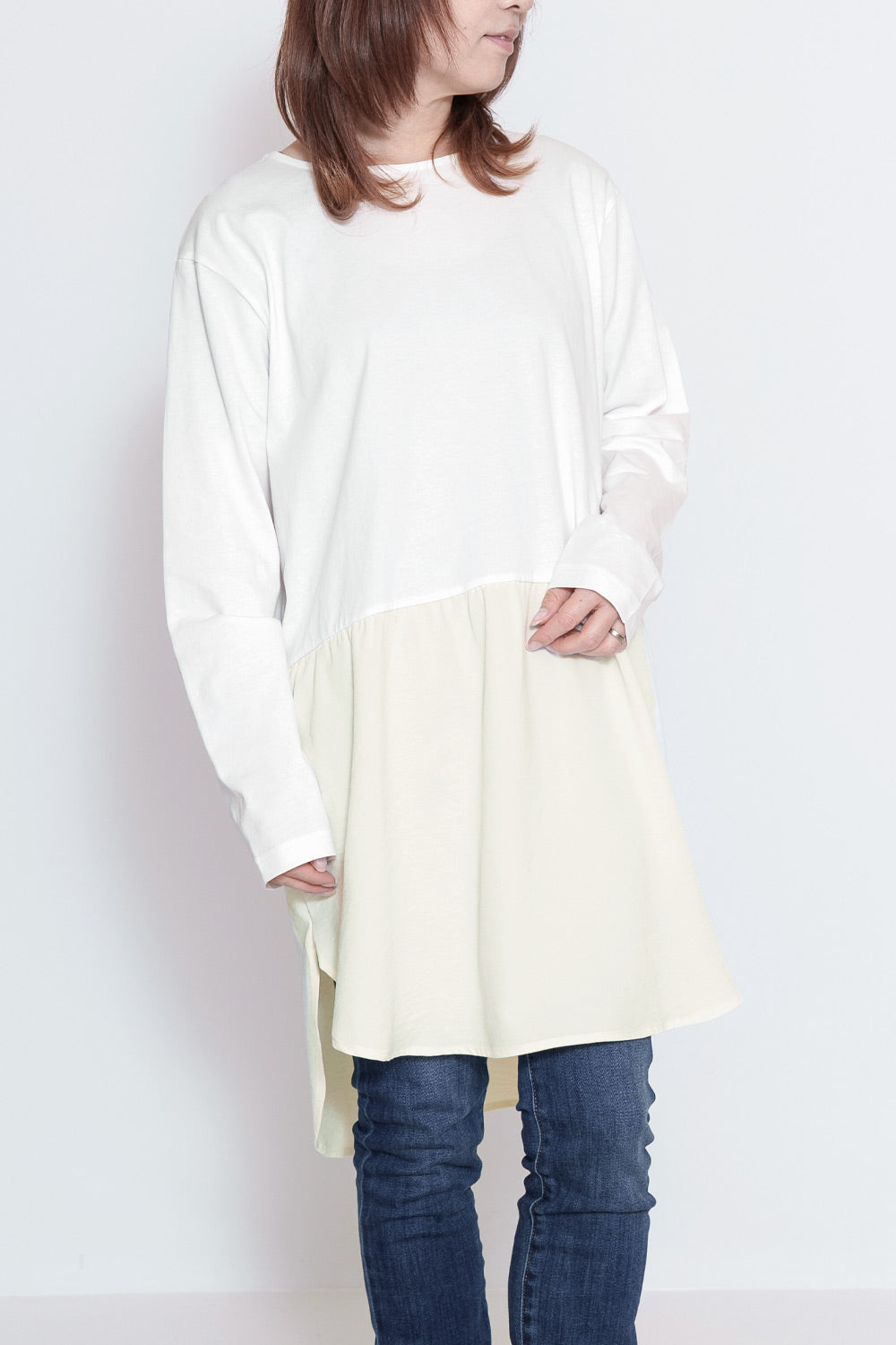 上身頃はやわらかなカットソー素材で心地よく、下身頃は自然なシワ感のある綺麗め素材を使用して、コントラストを生み出しました。