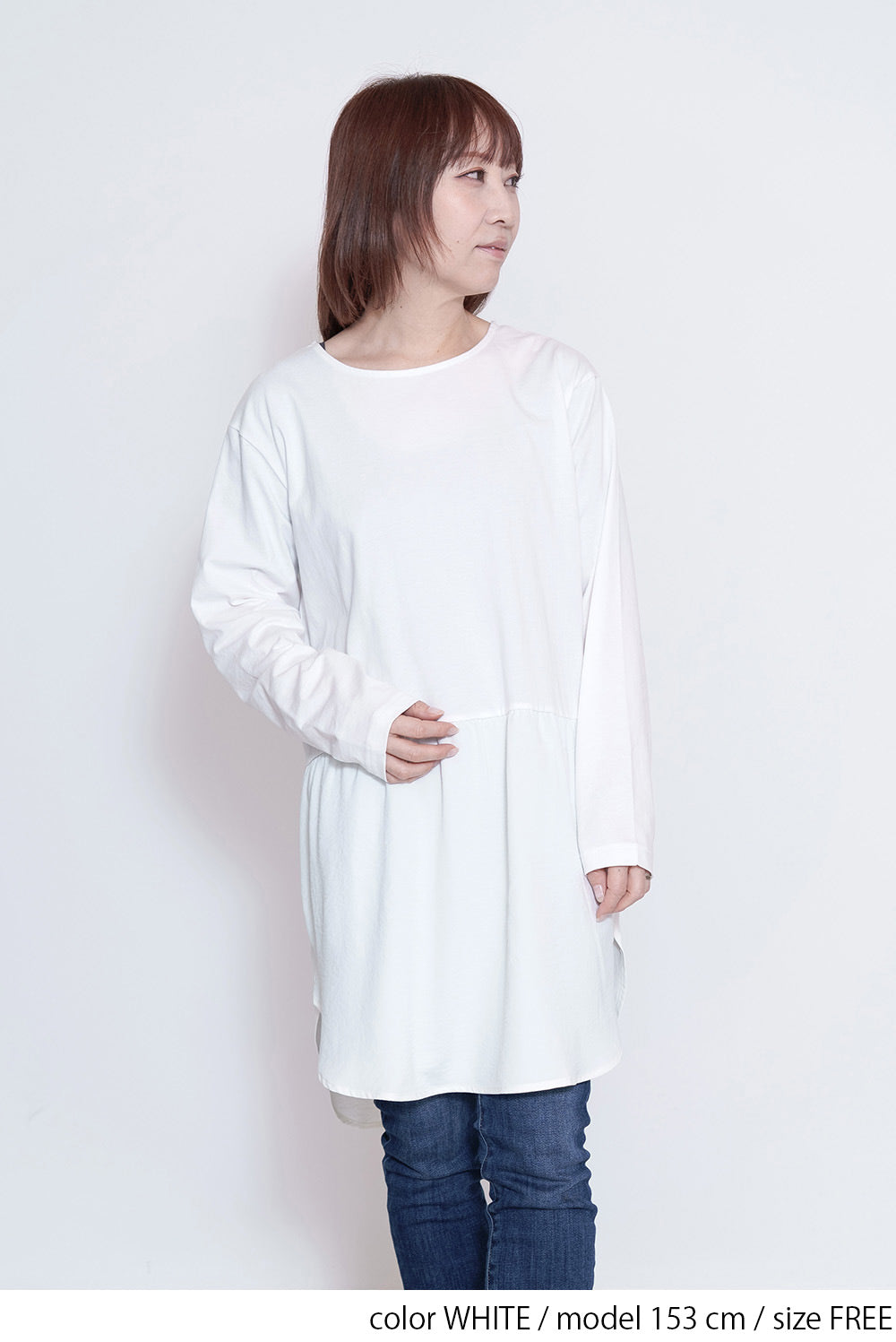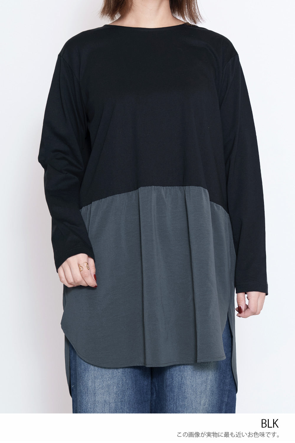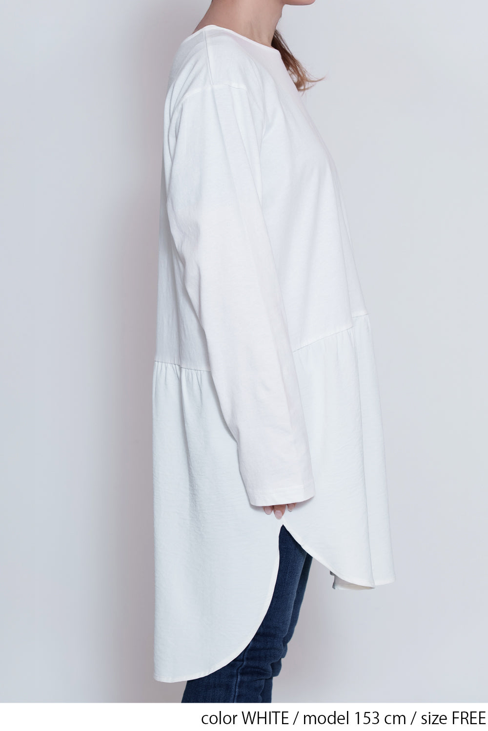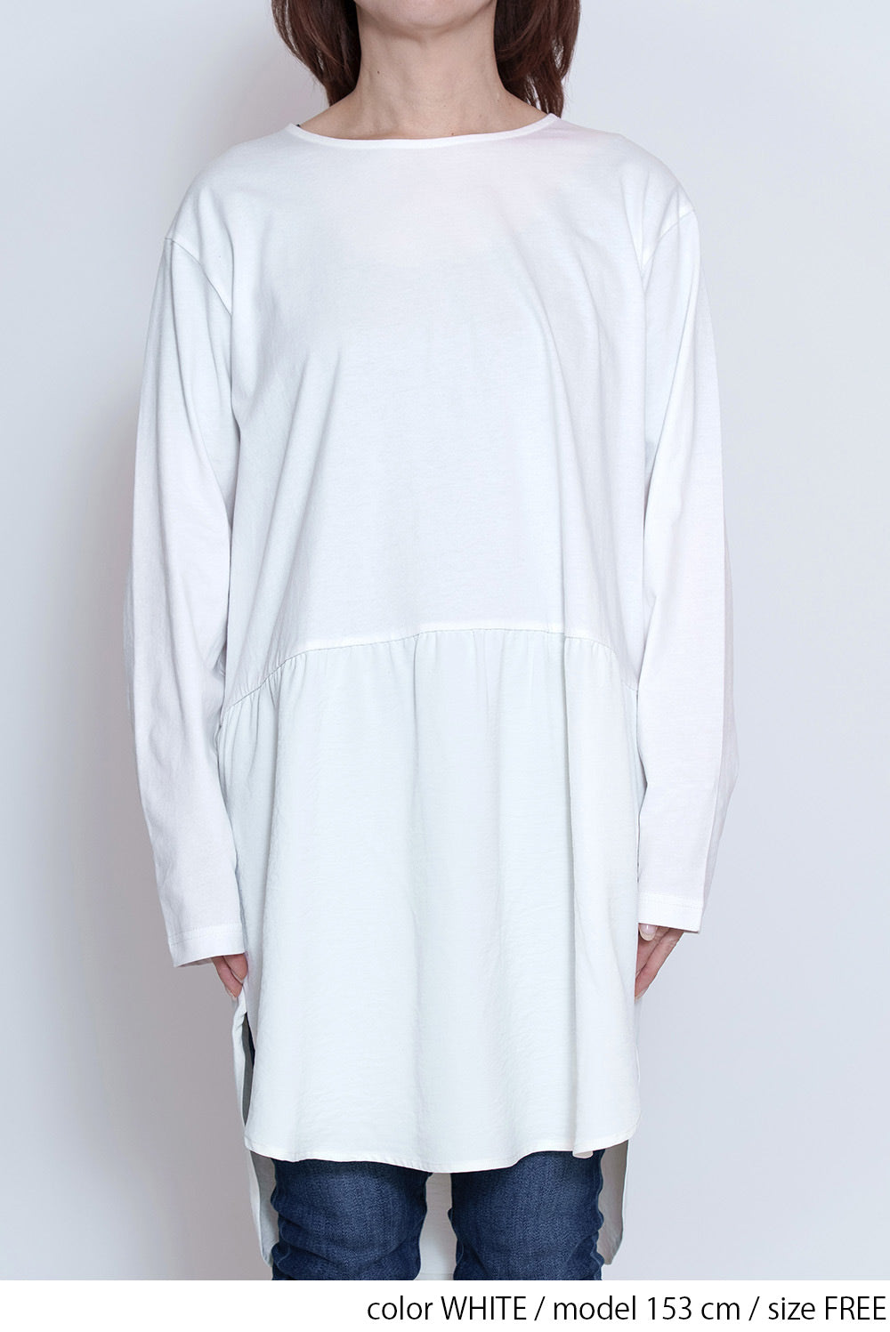 上身頃はやわらかなカットソー素材で心地よく、下身頃は自然なシワ感のある綺麗め素材を使用して、コントラストを生み出しました。