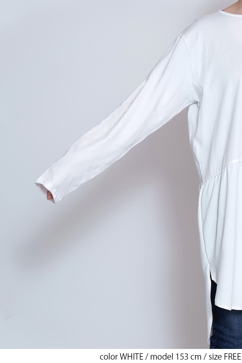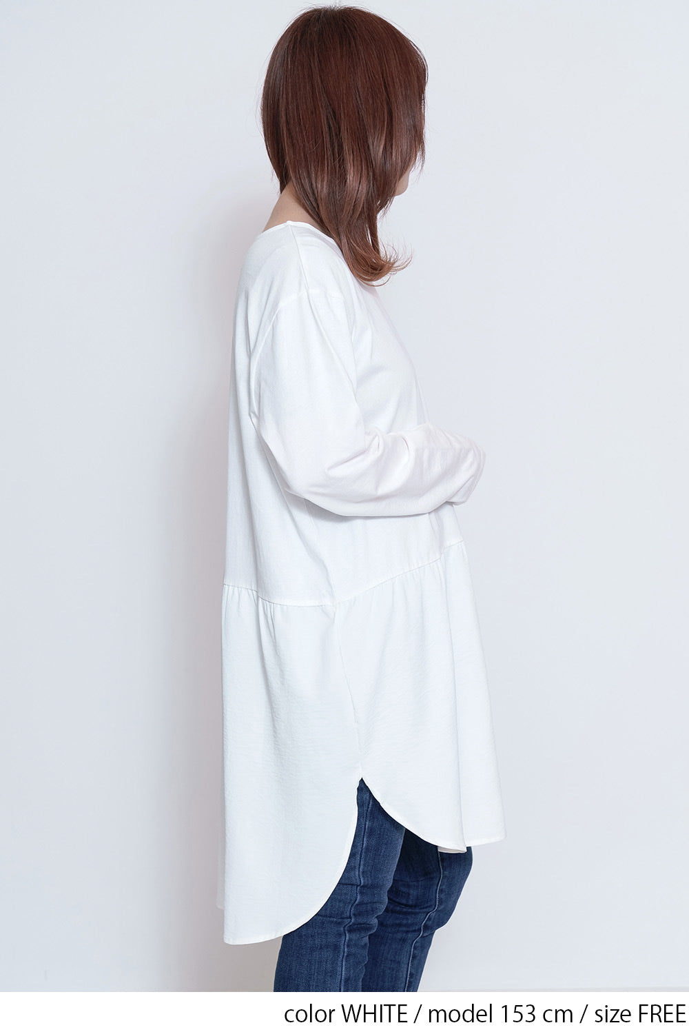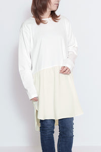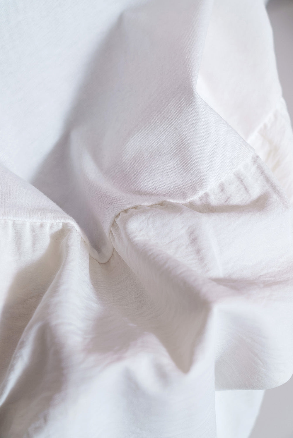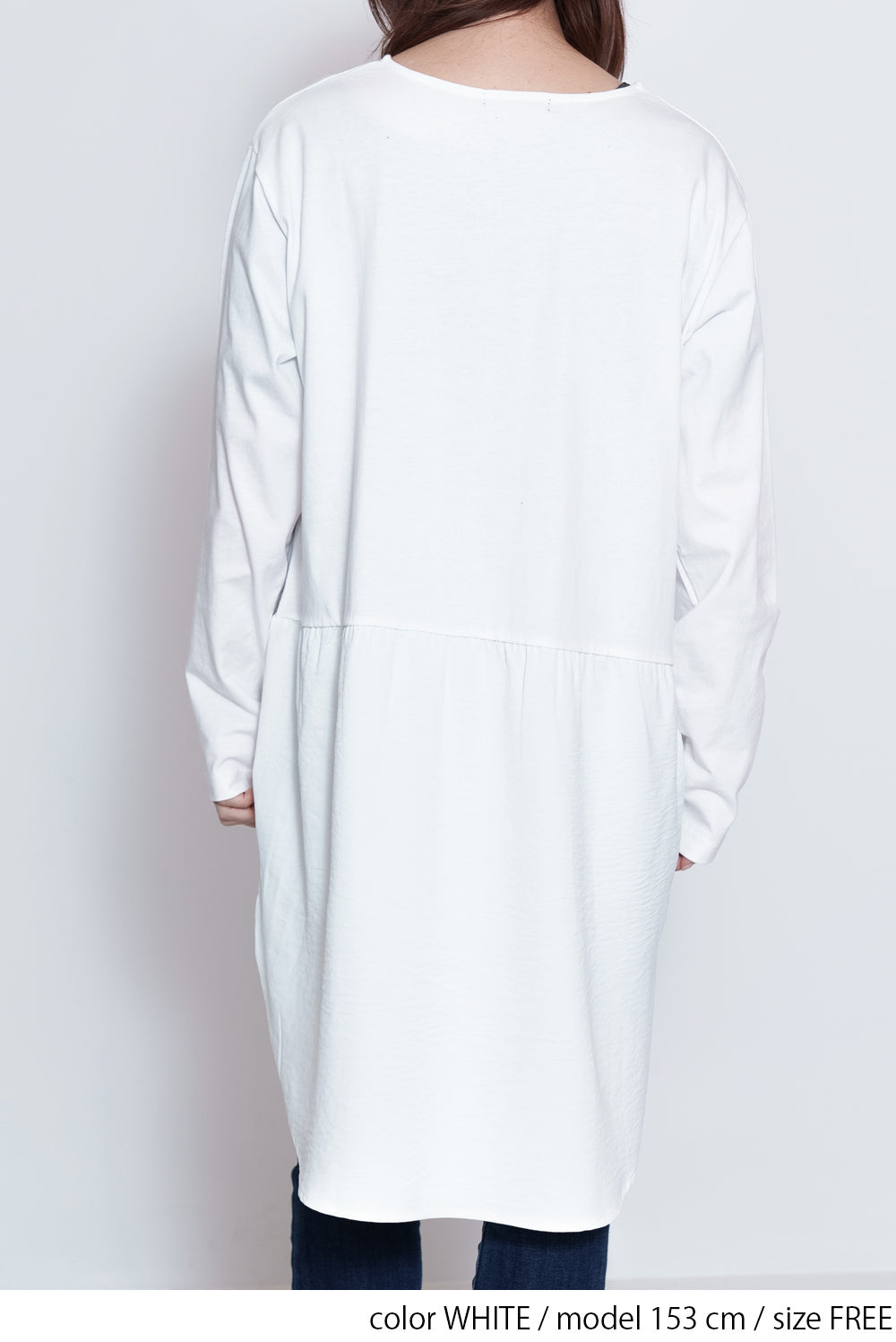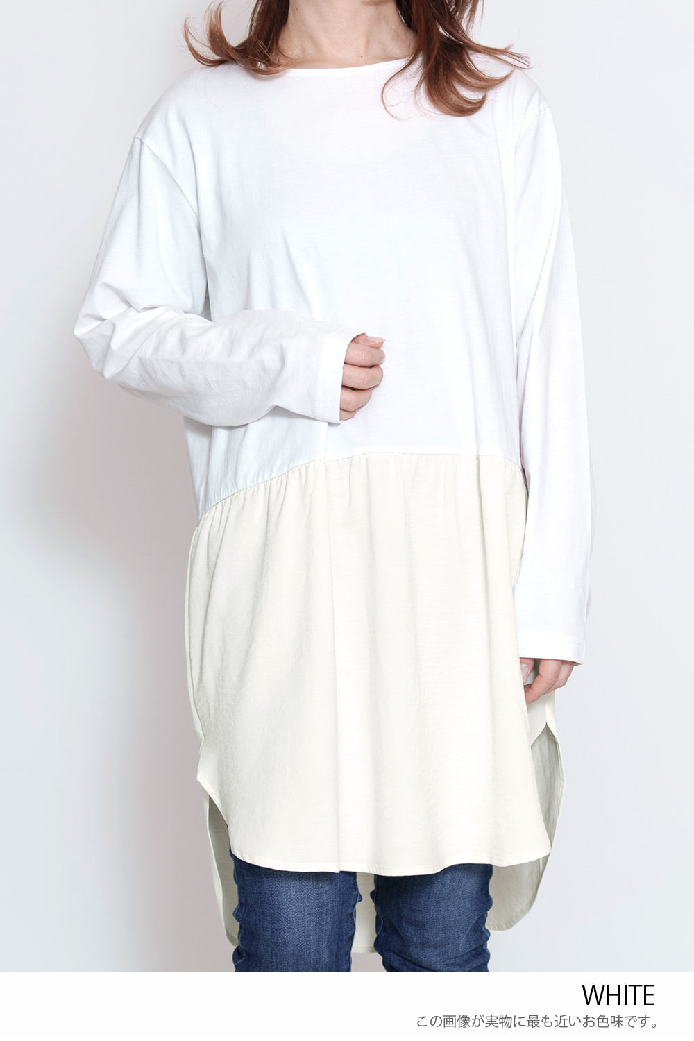 上身頃はやわらかなカットソー素材で心地よく、下身頃は自然なシワ感のある綺麗め素材を使用して、コントラストを生み出しました。