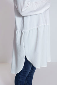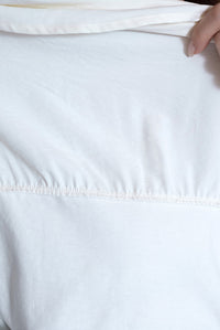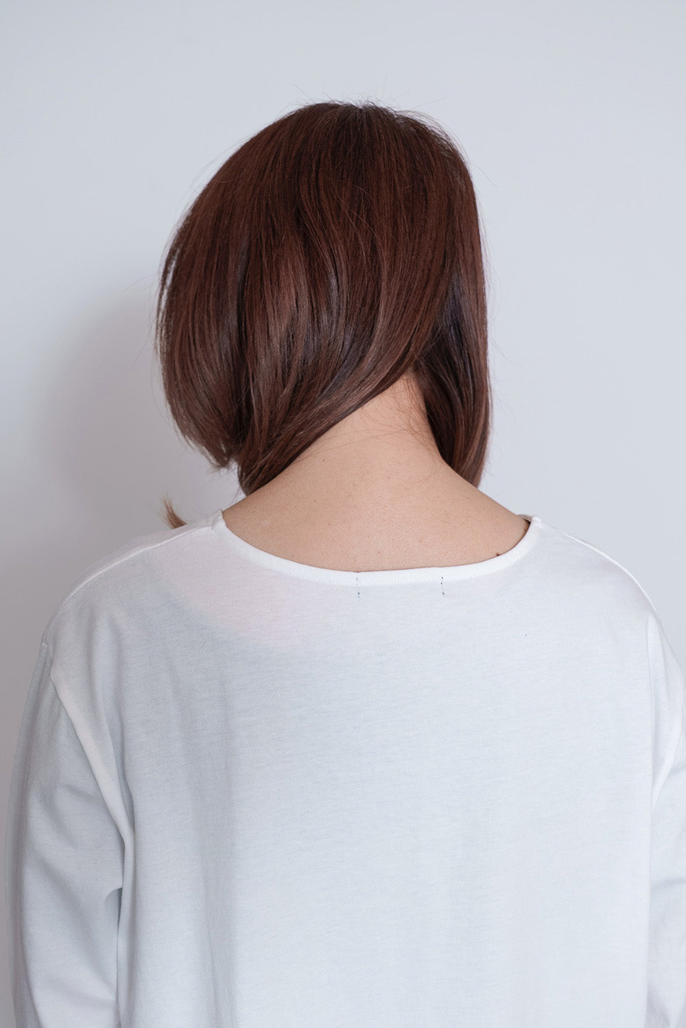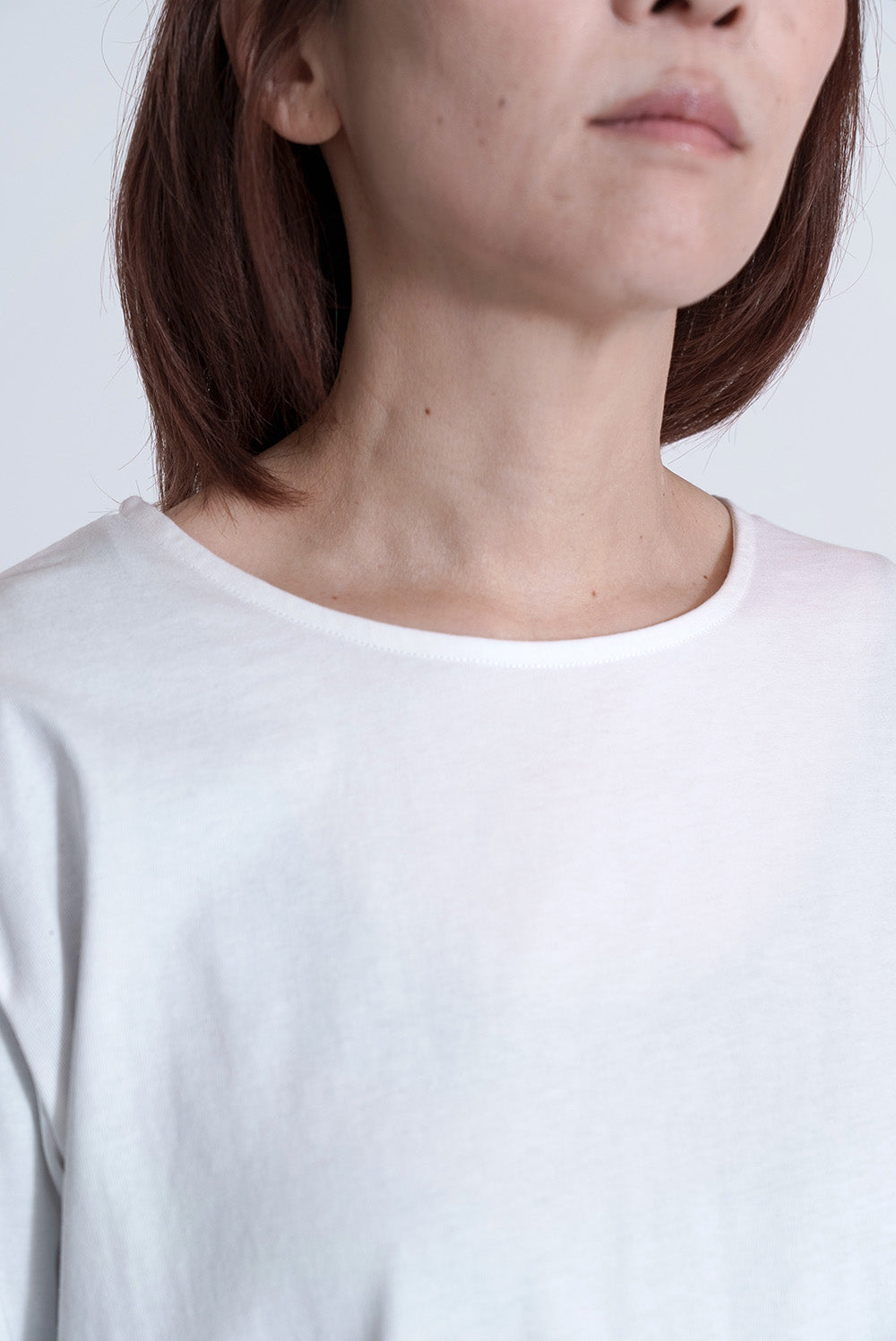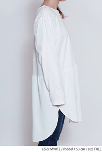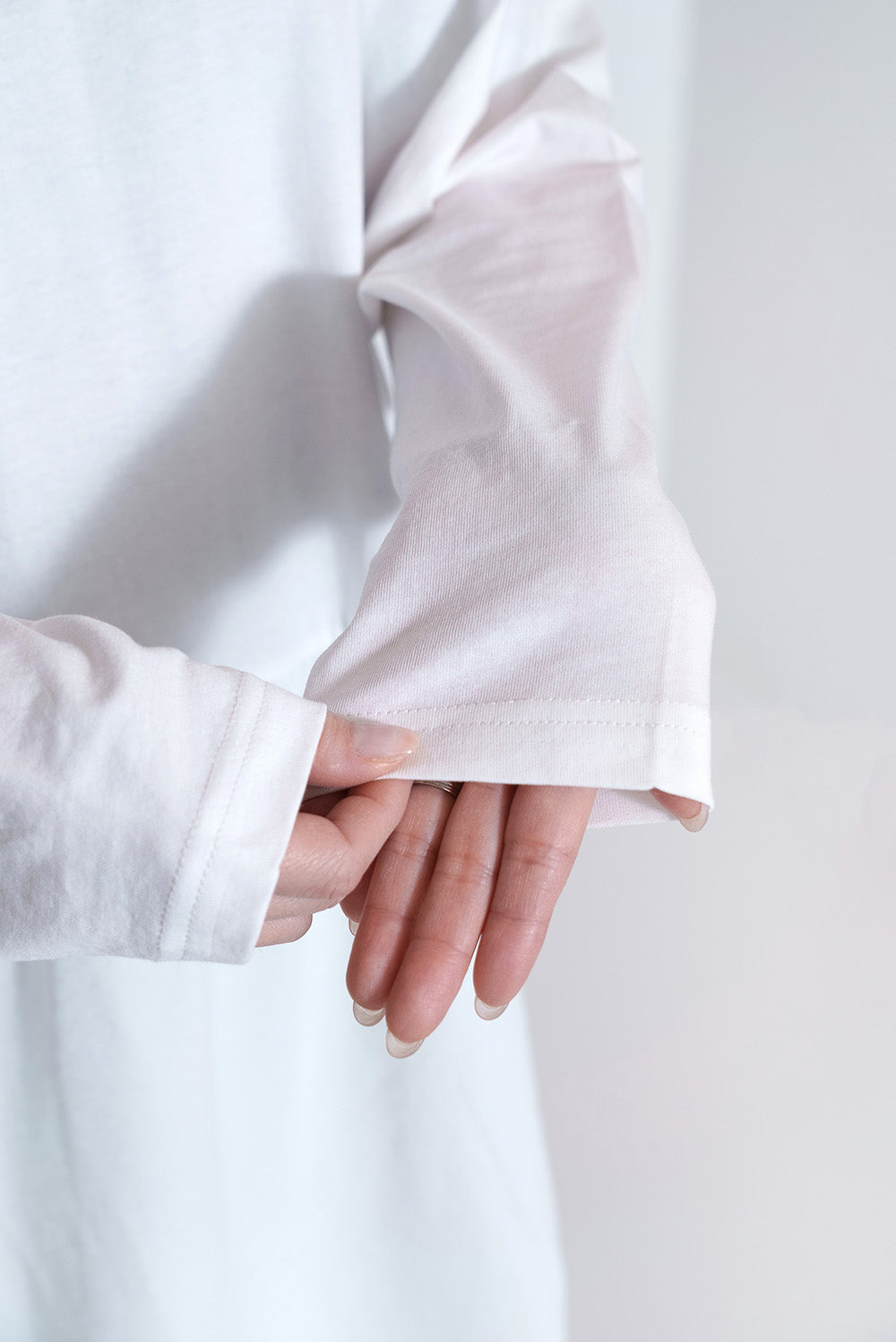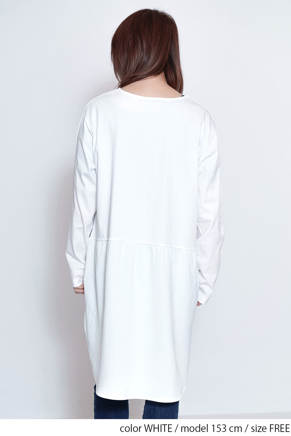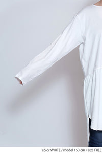 上身頃はやわらかなカットソー素材で心地よく、下身頃は自然なシワ感のある綺麗め素材を使用して、コントラストを生み出しました。
