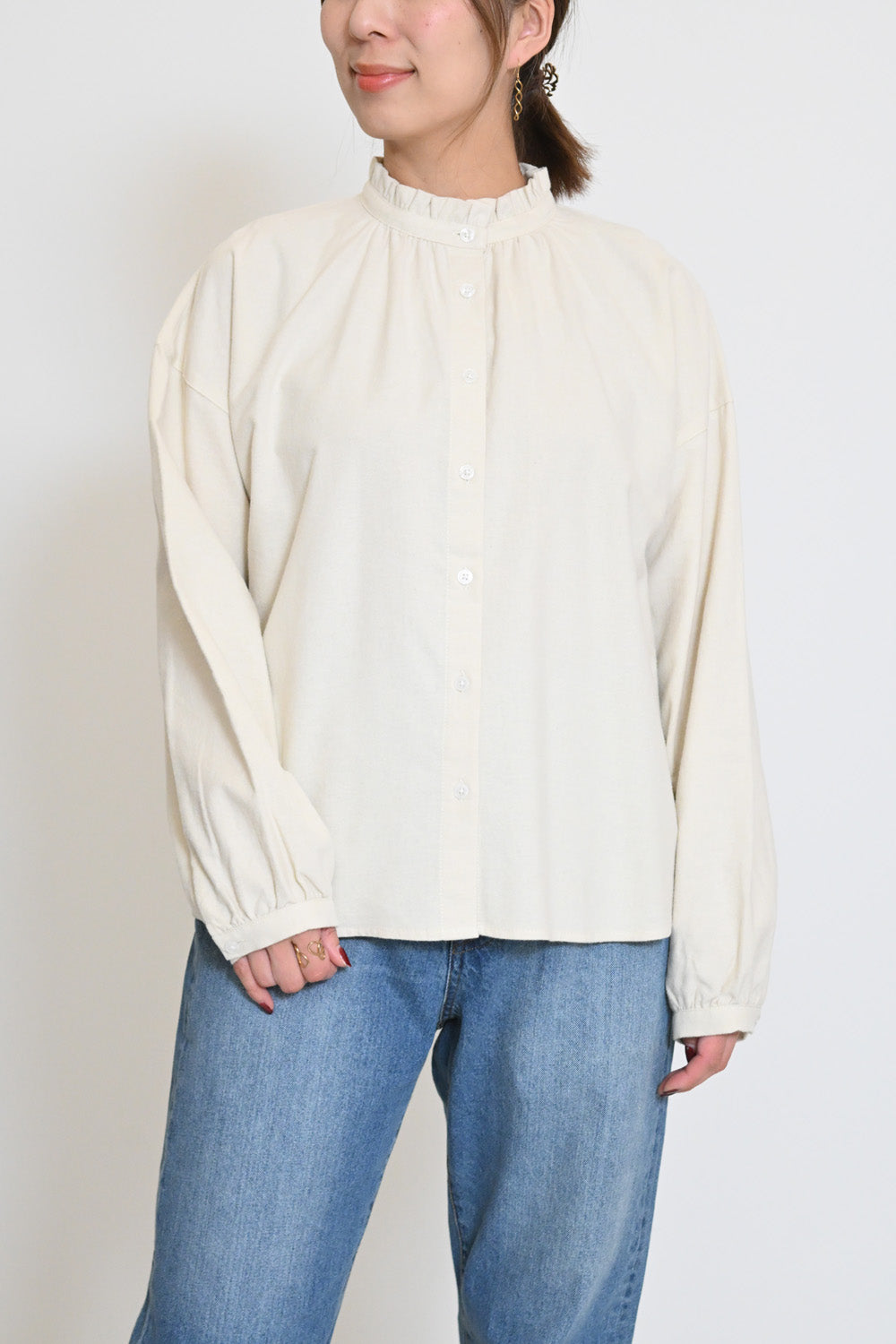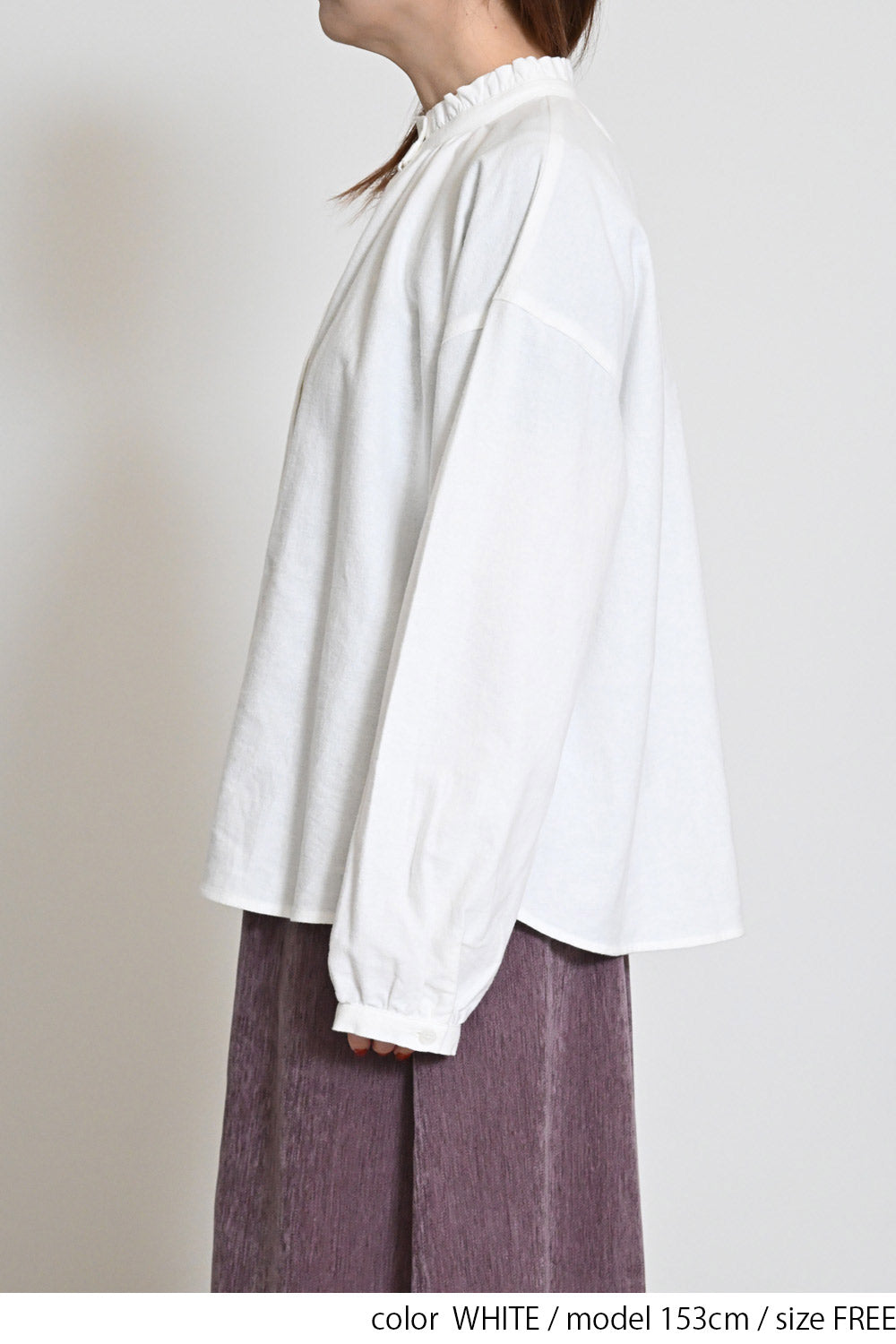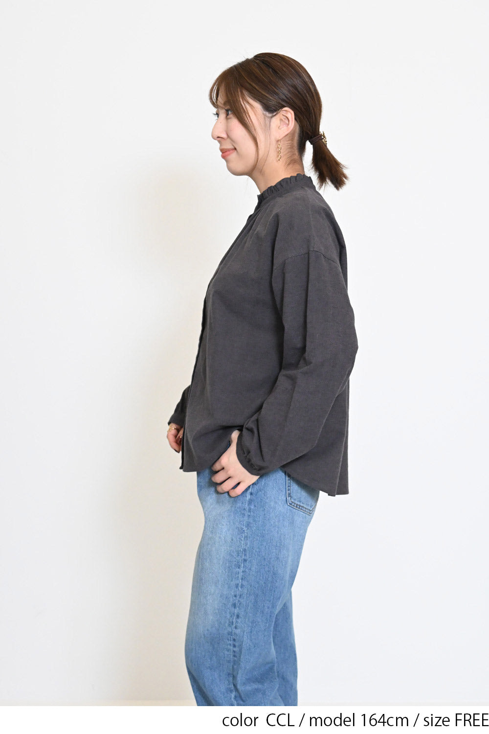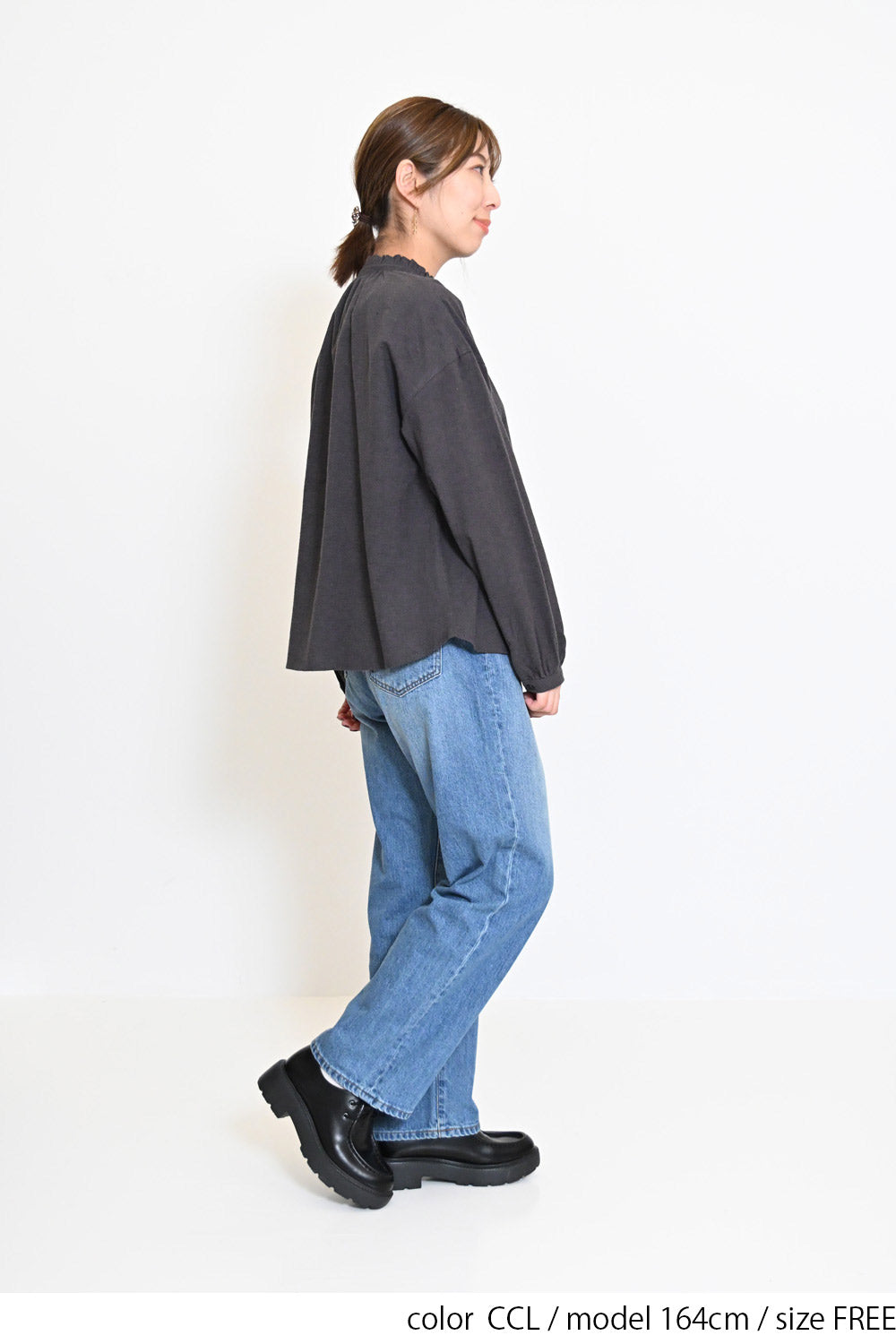首元にさりげない華やかさを添えてくれるフリルが、スウェットやニットと相性抜群。