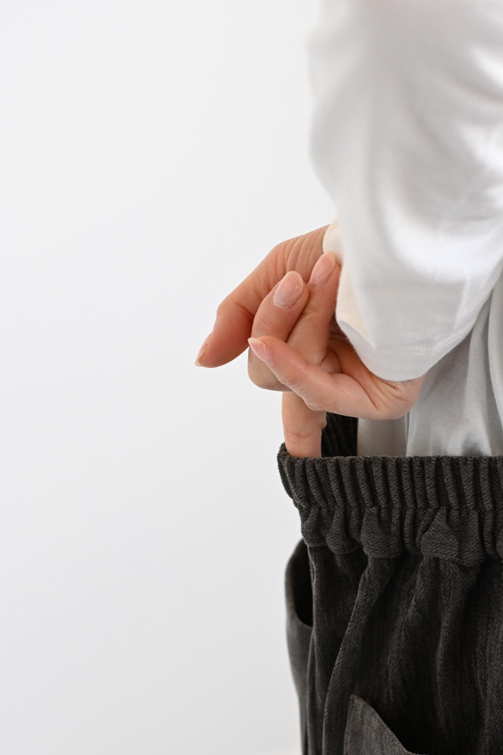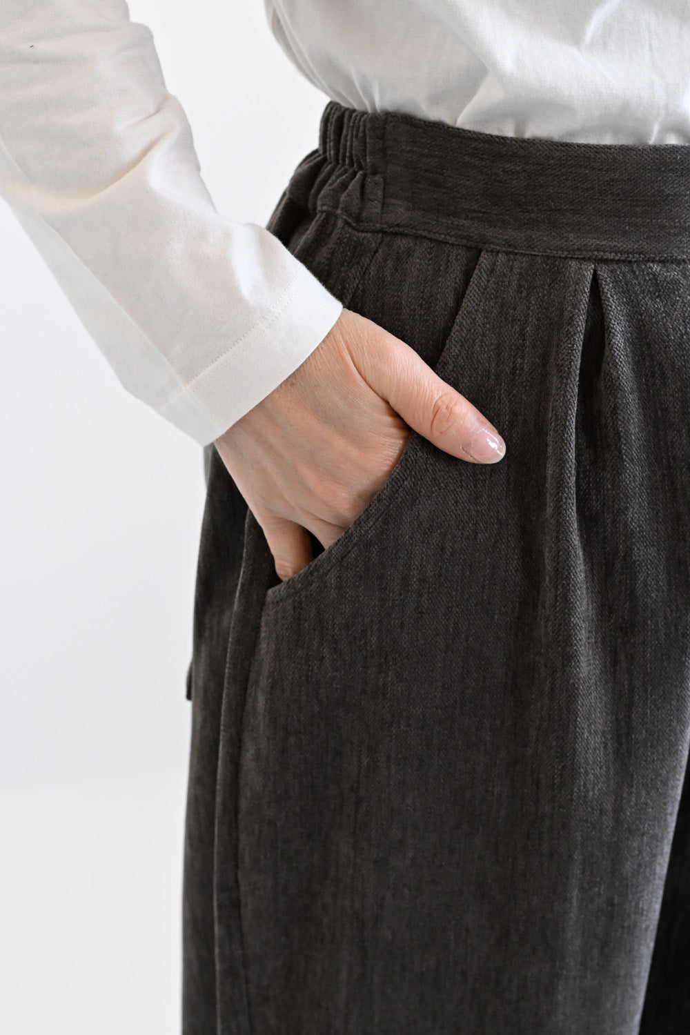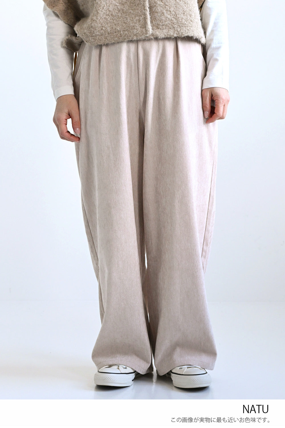 程よく丸みをもたせたバレルシルエットが、気になる脚のラインを自然にカバーしつつ、女性らしい柔らかな印象を演出。
