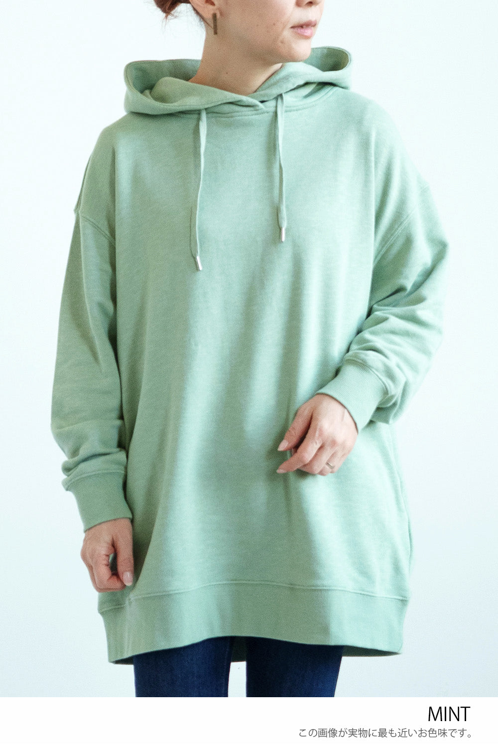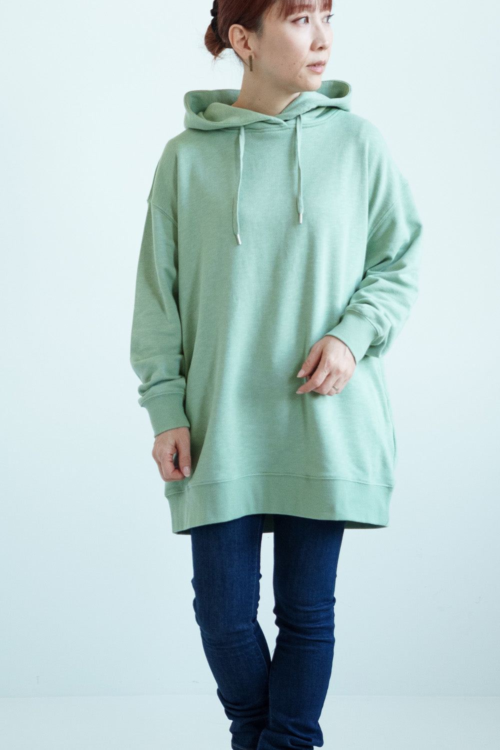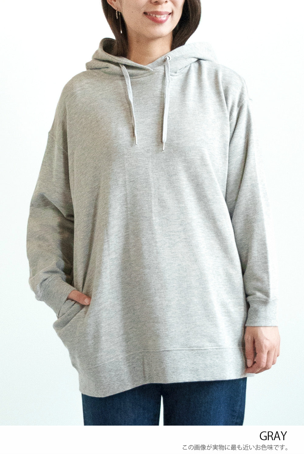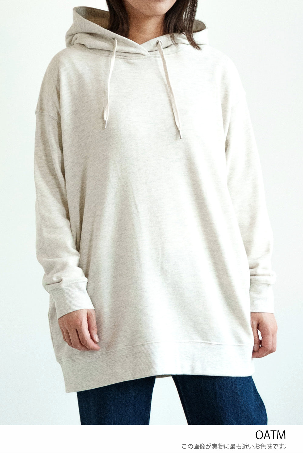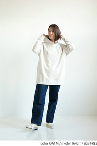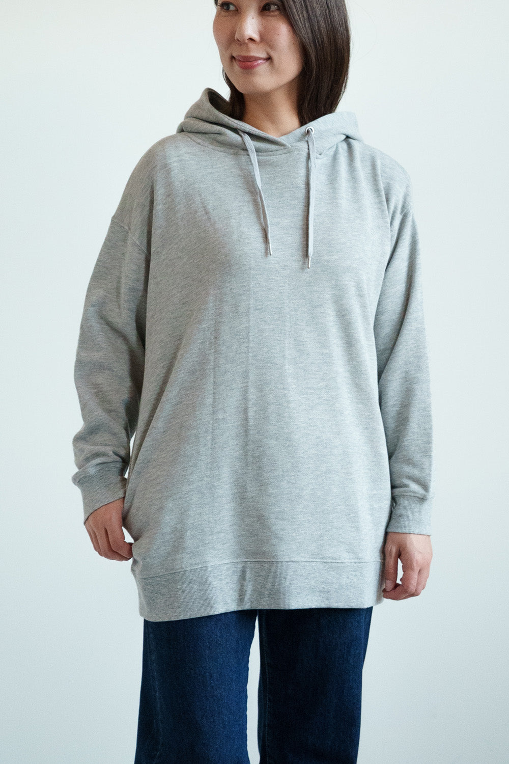 ゆったりとしたオーバーサイズシルエットと、ヒップまでしっかり隠れるチュニック丈が、体のラインをさりげなくカバー。