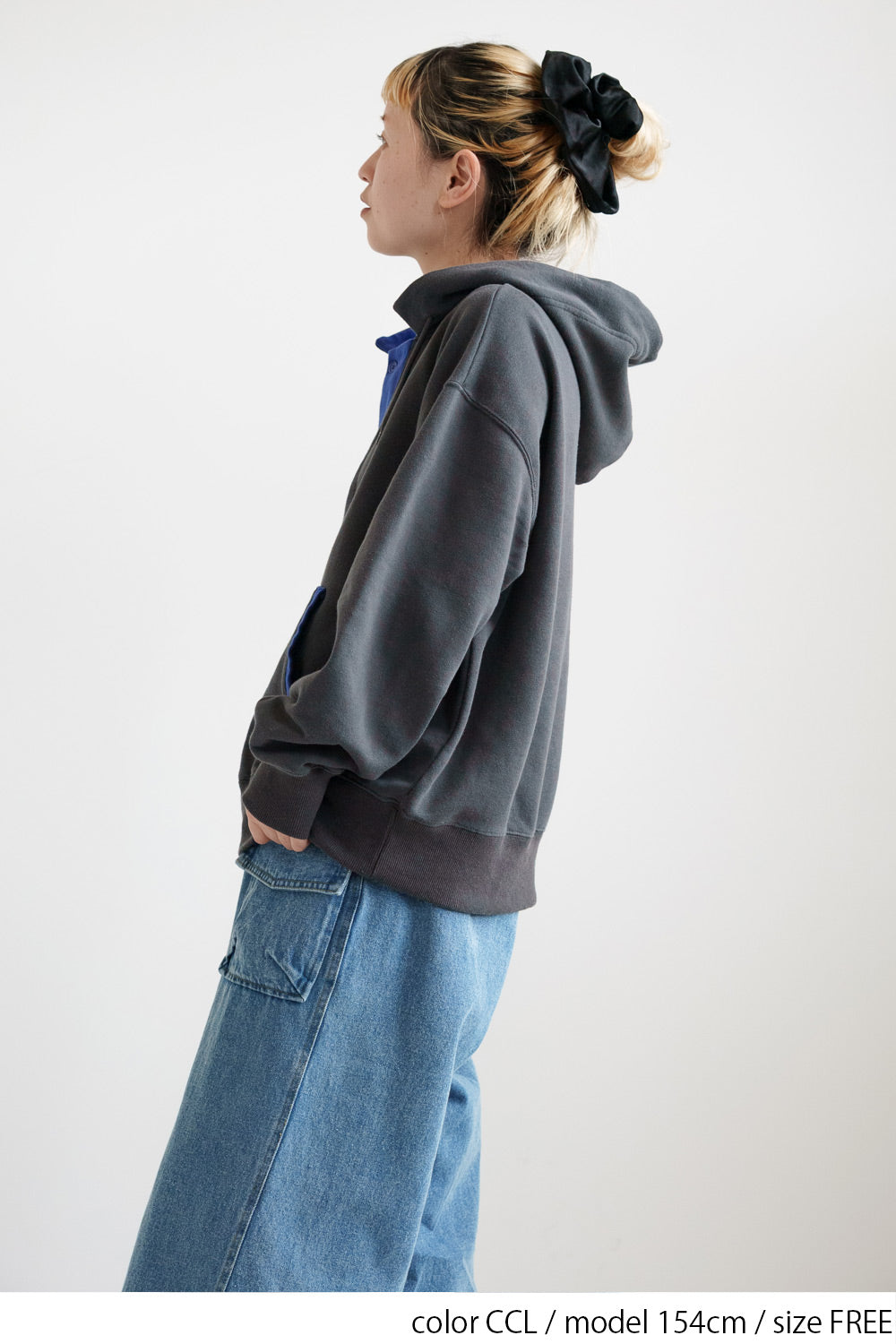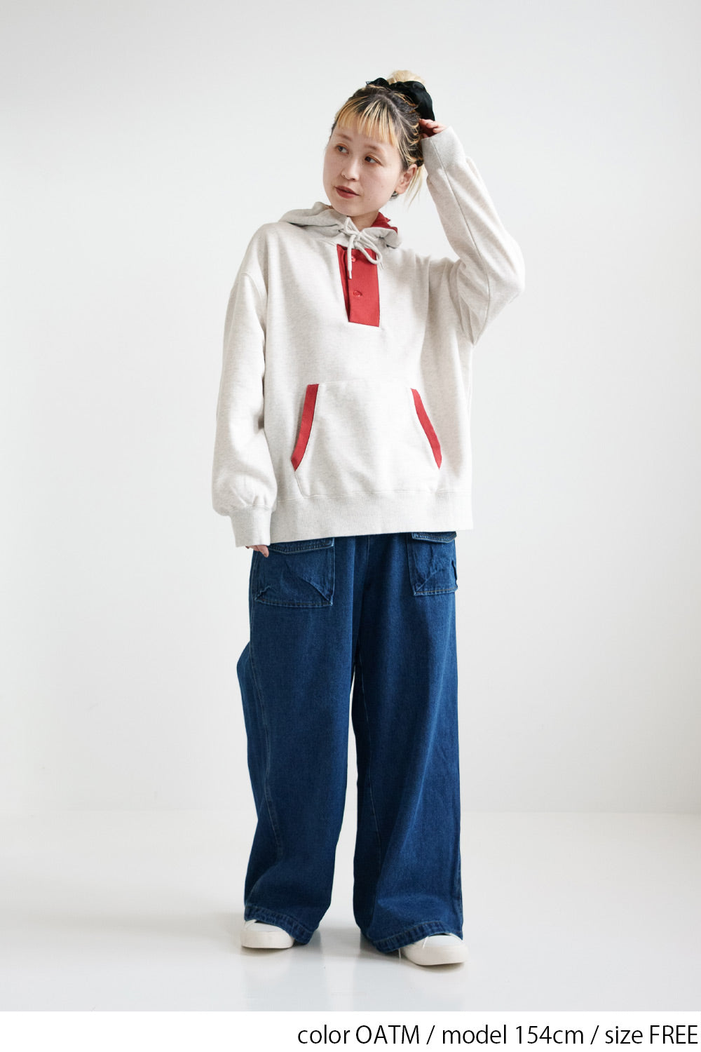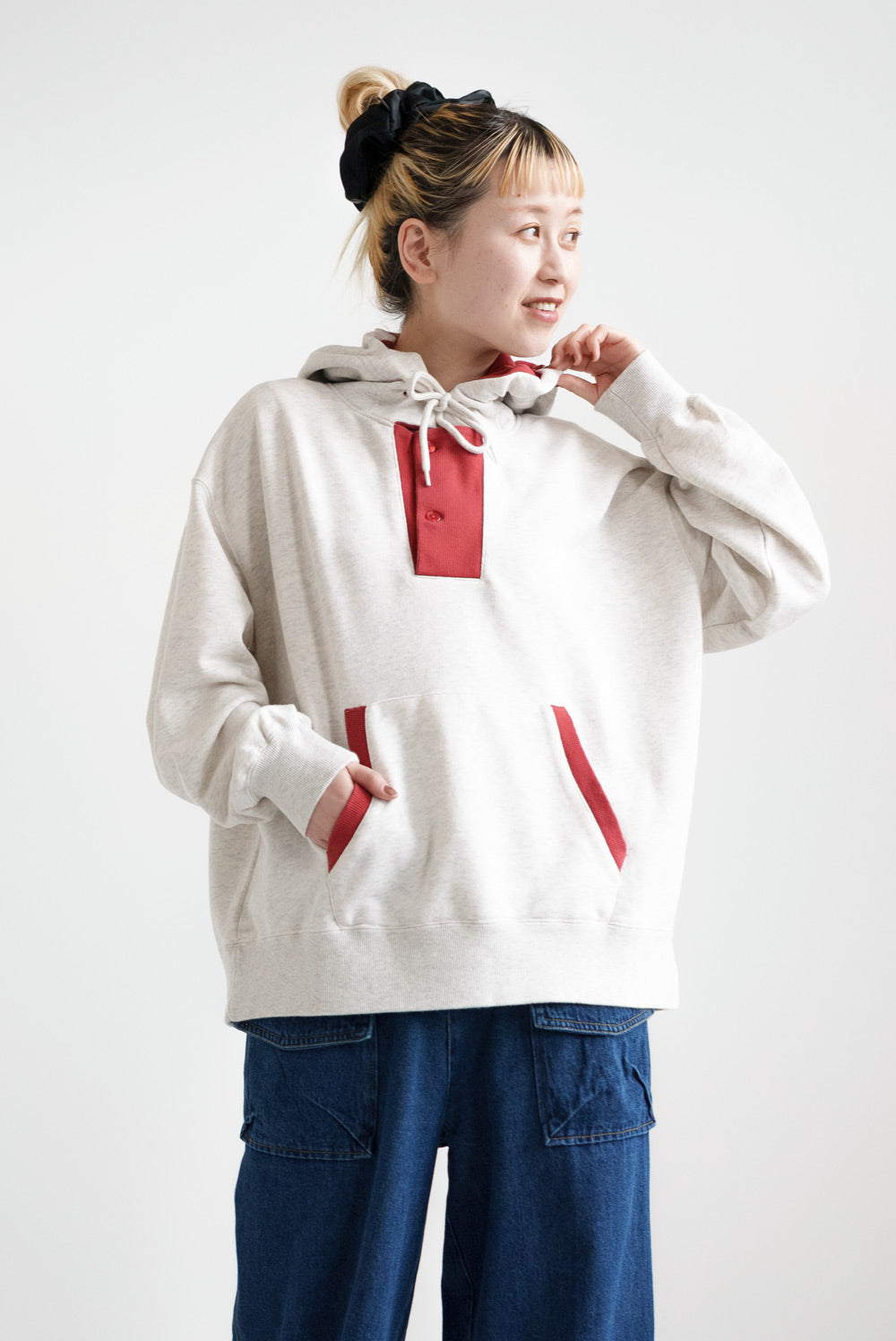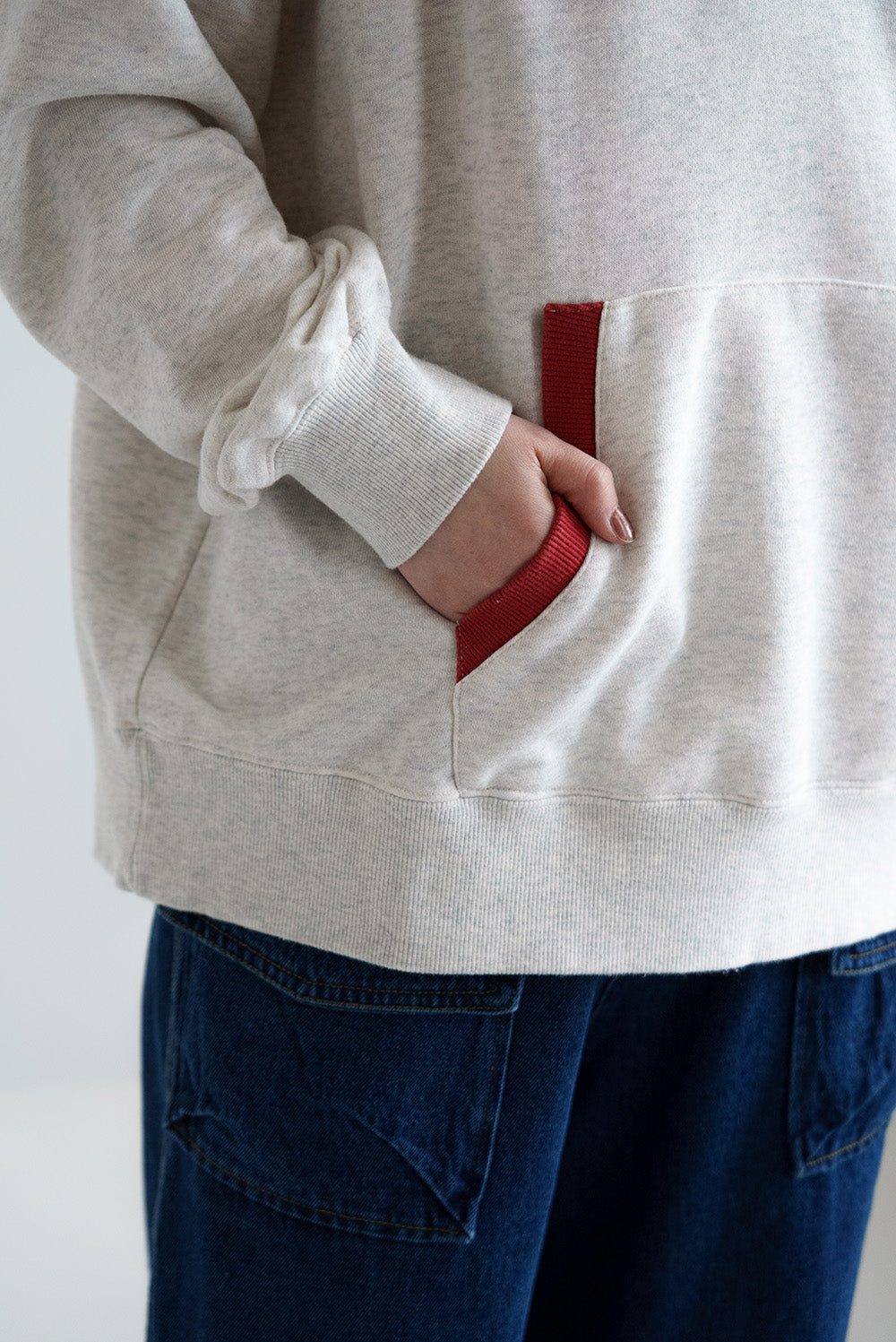首元とポケットリブに効かせた差し色が、シンプルなパーカースタイリングにさりげない個性をプラス。