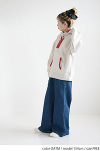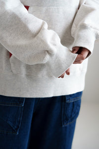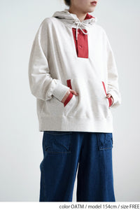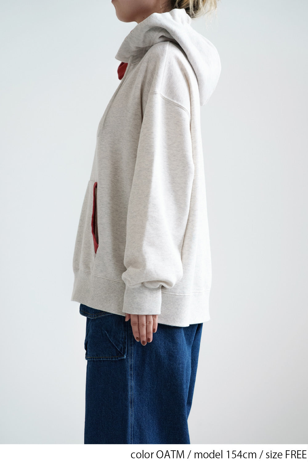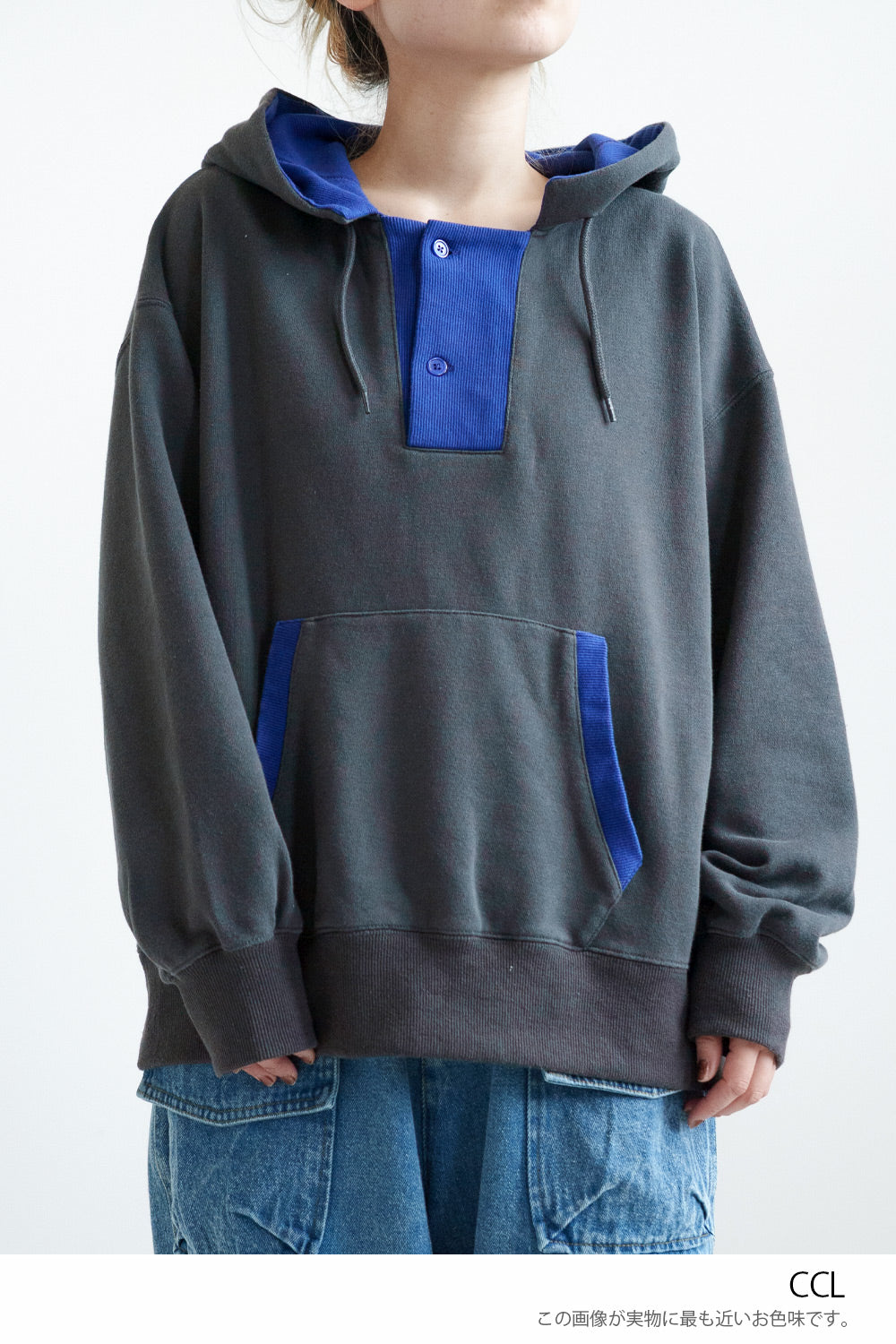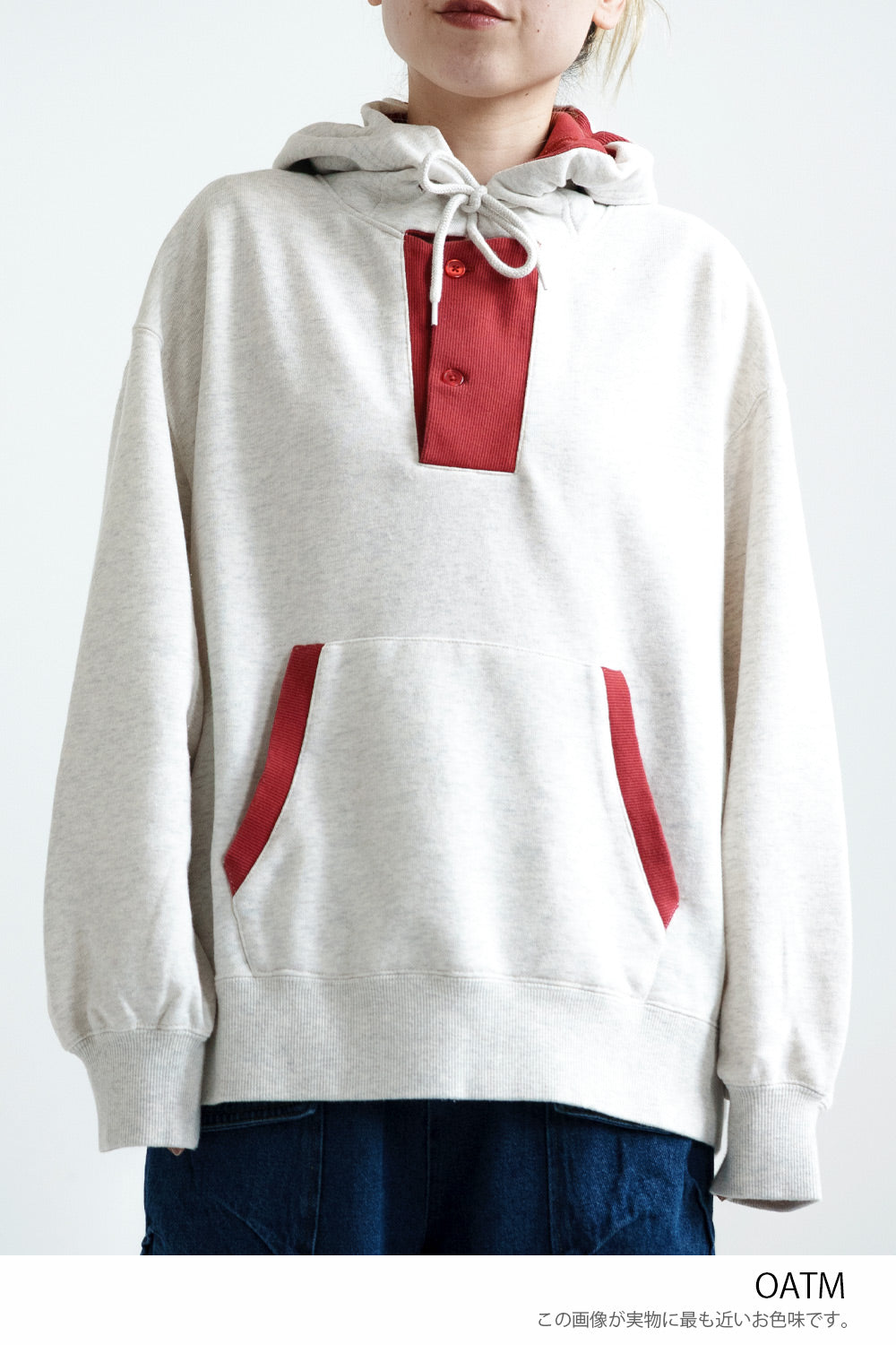 首元とポケットリブに効かせた差し色が、シンプルなパーカースタイリングにさりげない個性をプラス。