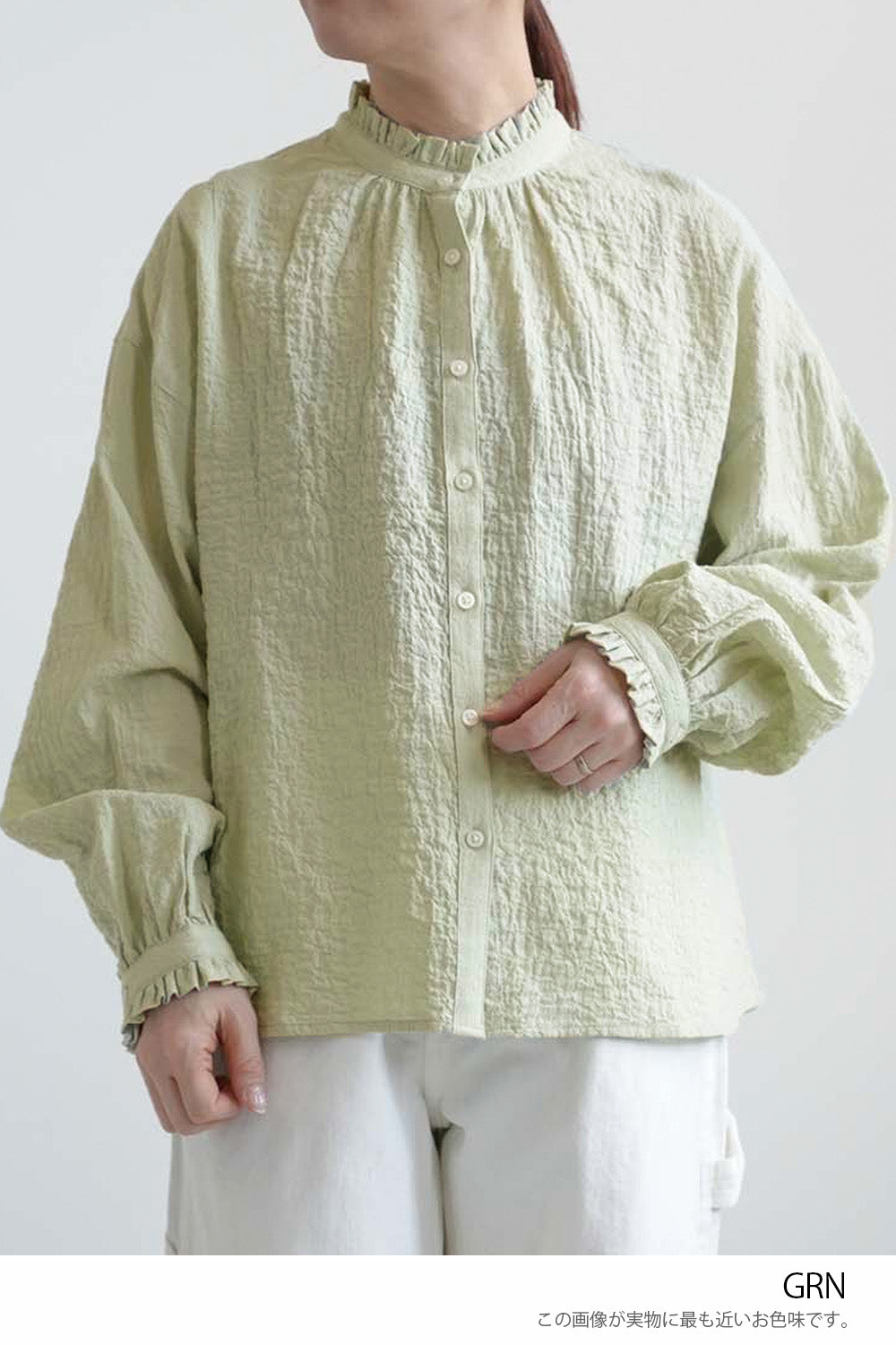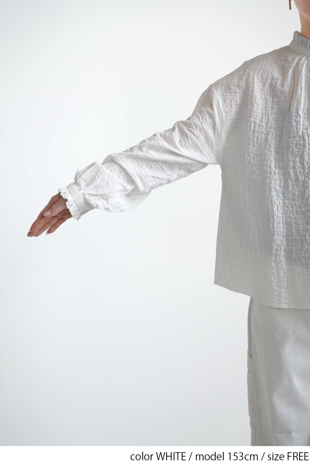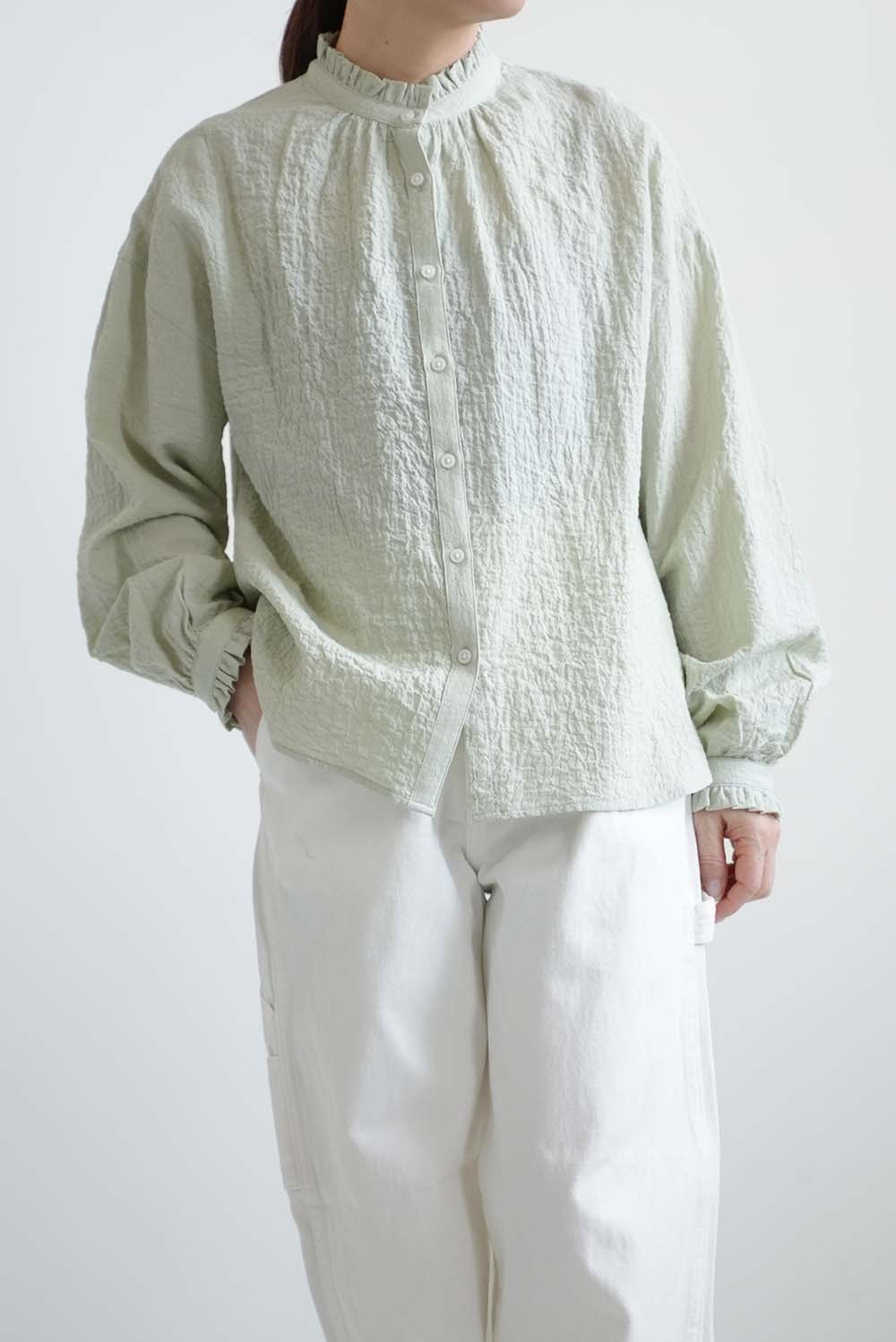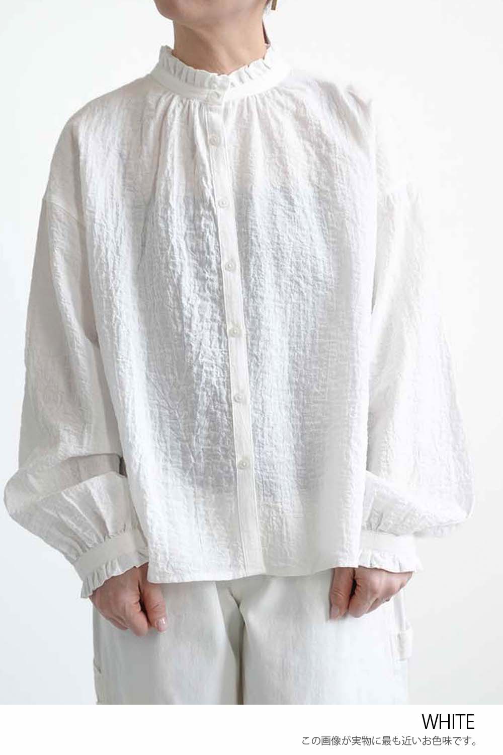 顔まわりを明るく見せてくれるえり元に加え、袖口にもフリルを施し、さりげない可愛らしさを添えました。