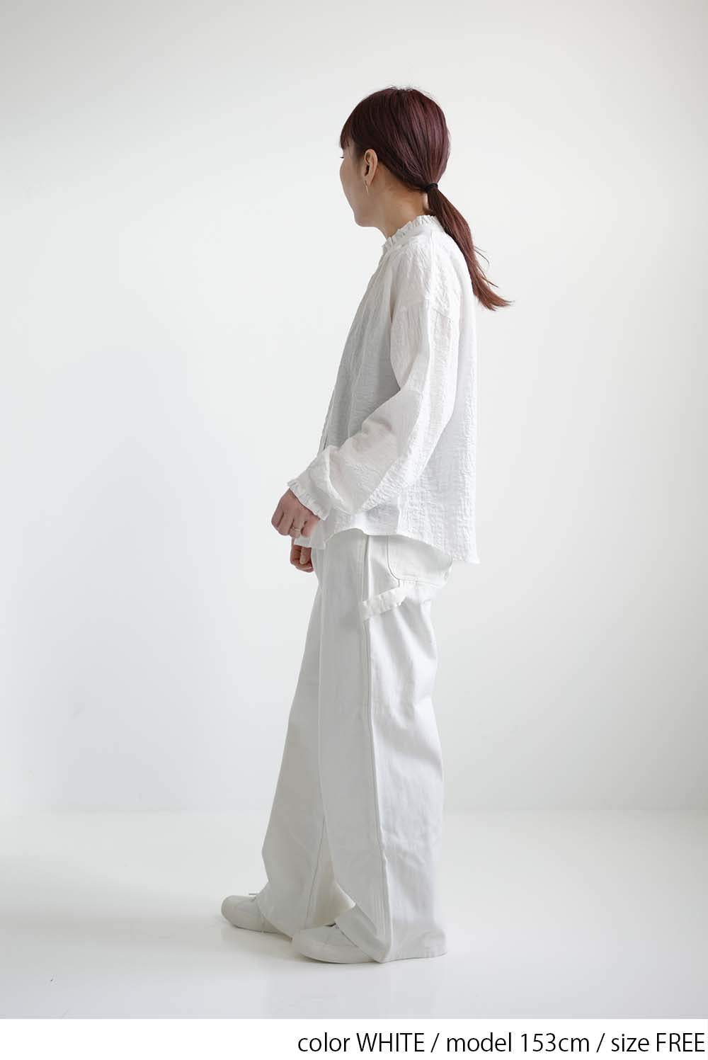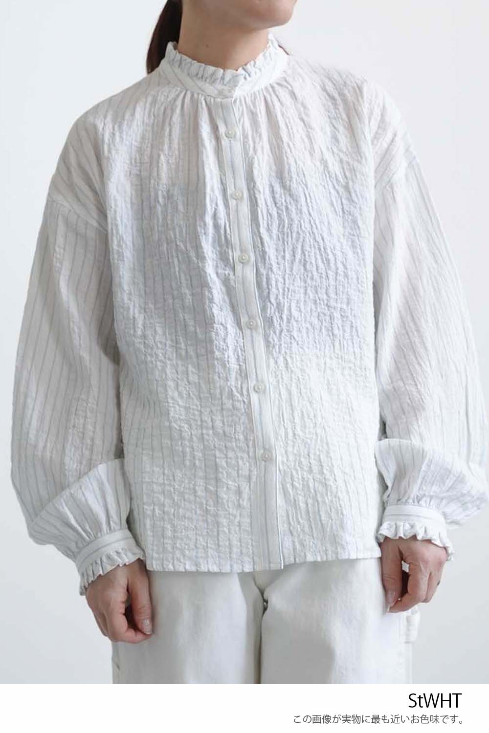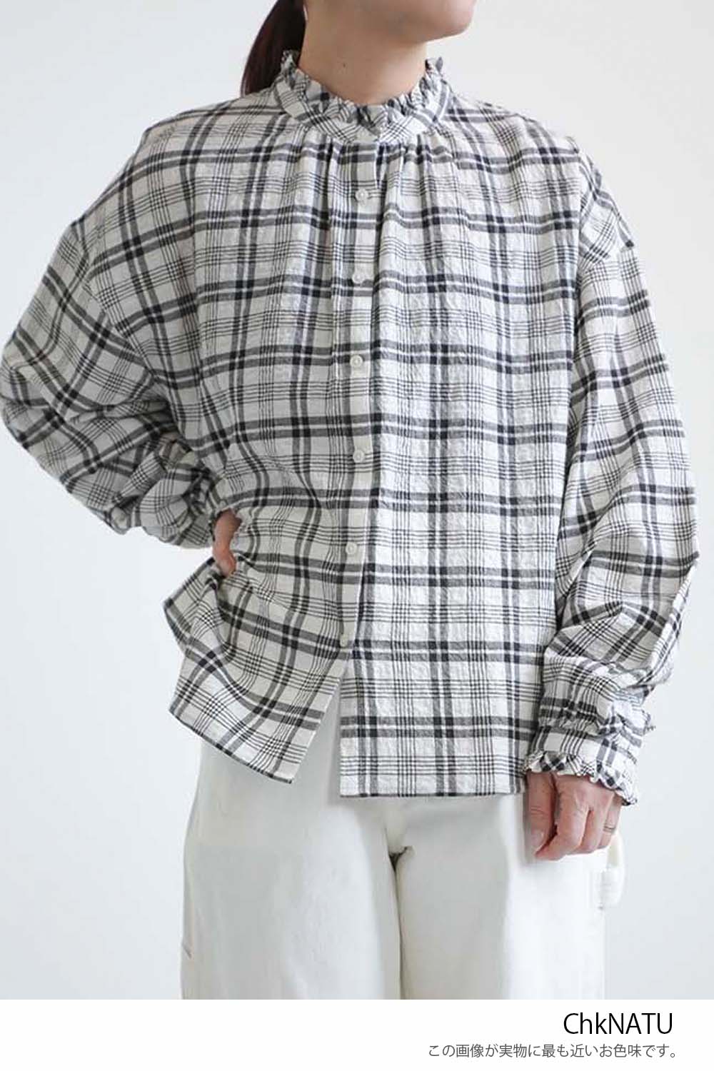 顔まわりを明るく見せてくれるえり元に加え、袖口にもフリルを施し、さりげない可愛らしさを添えました。