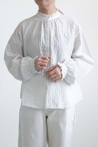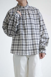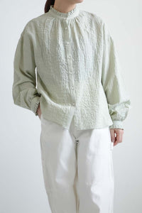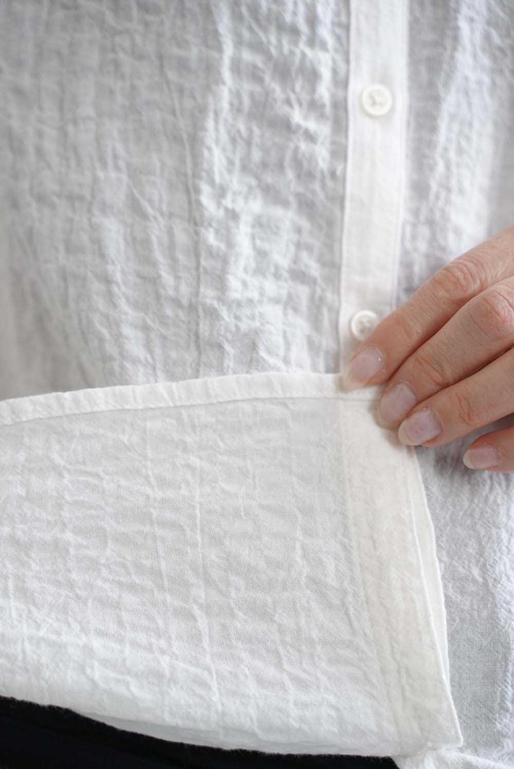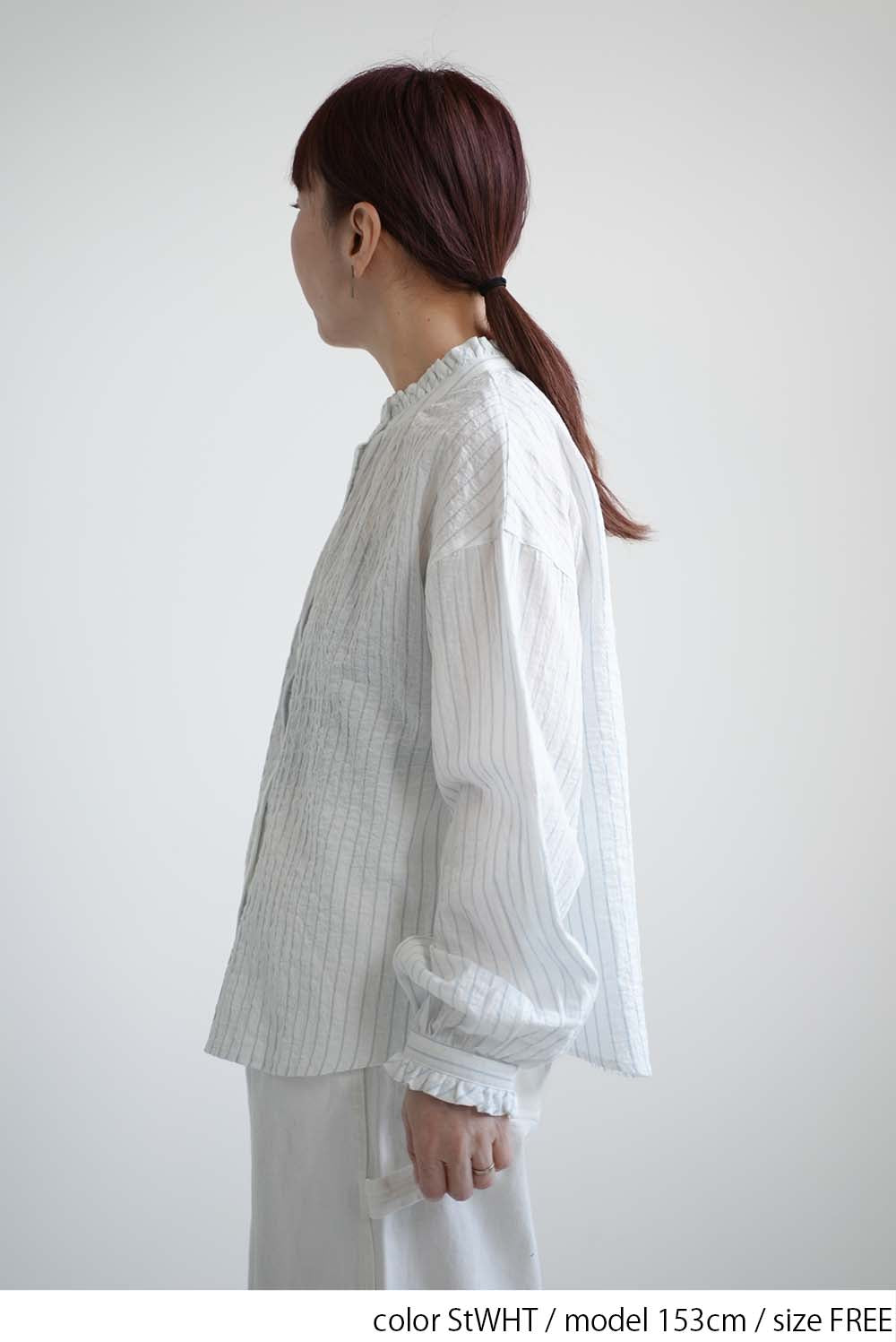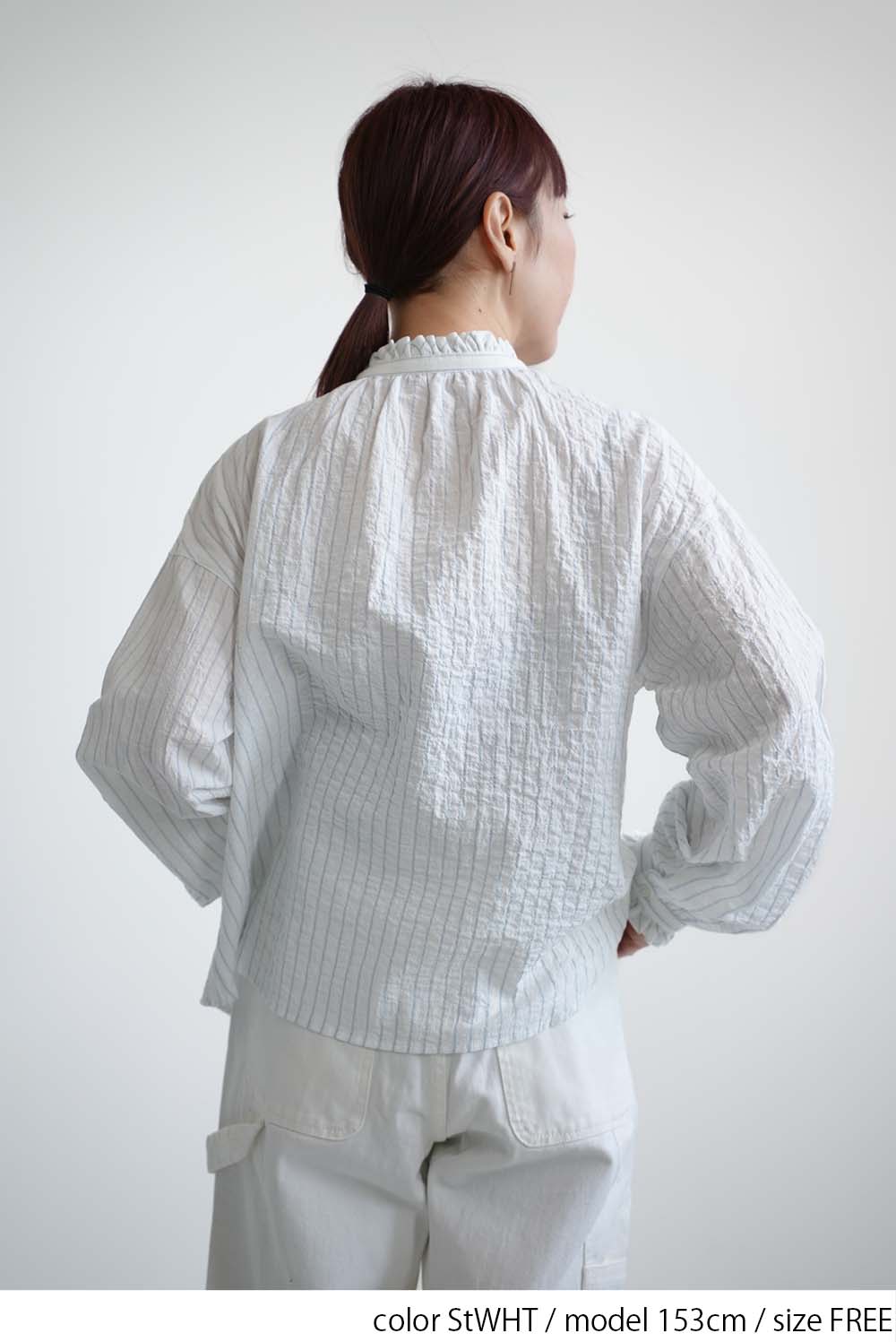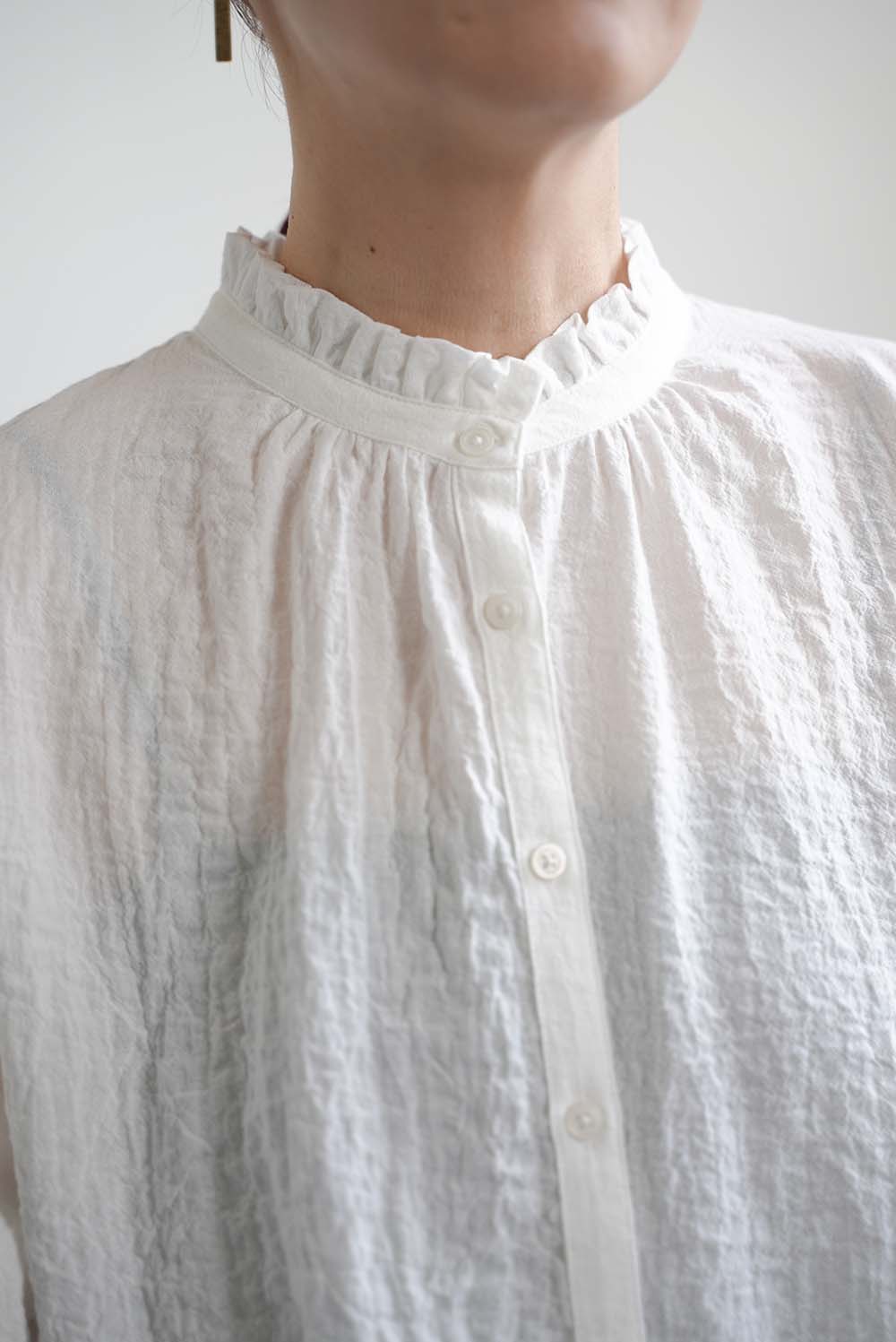 顔まわりを明るく見せてくれるえり元に加え、袖口にもフリルを施し、さりげない可愛らしさを添えました。