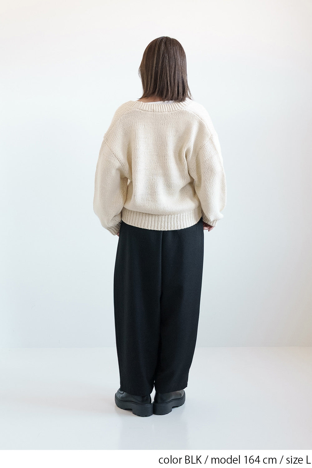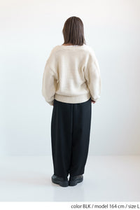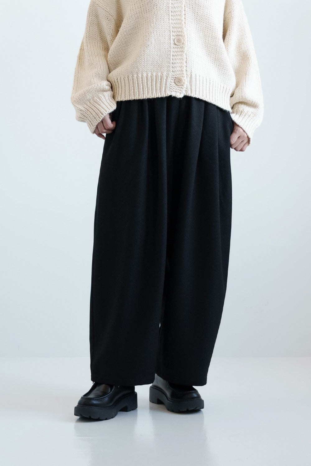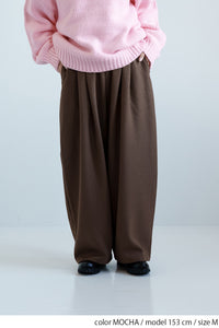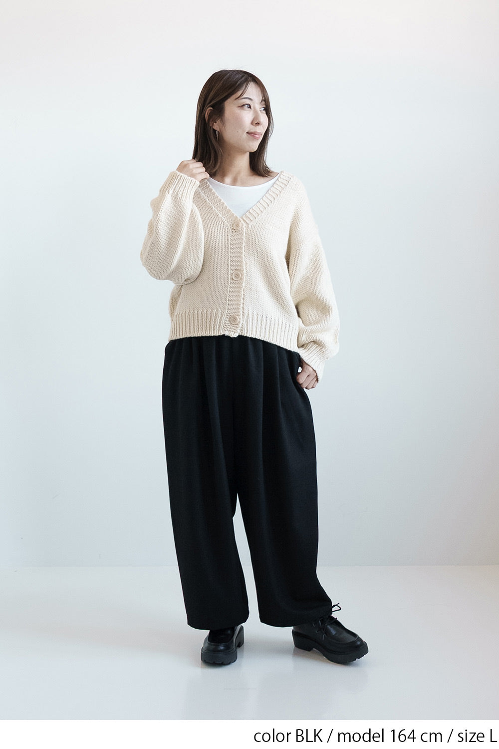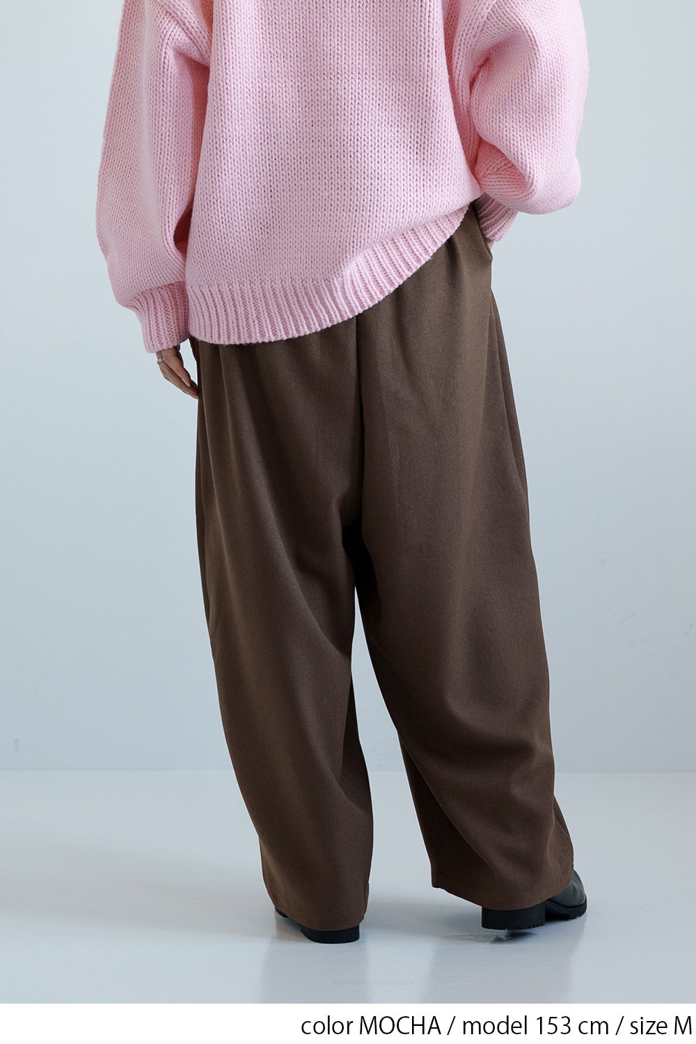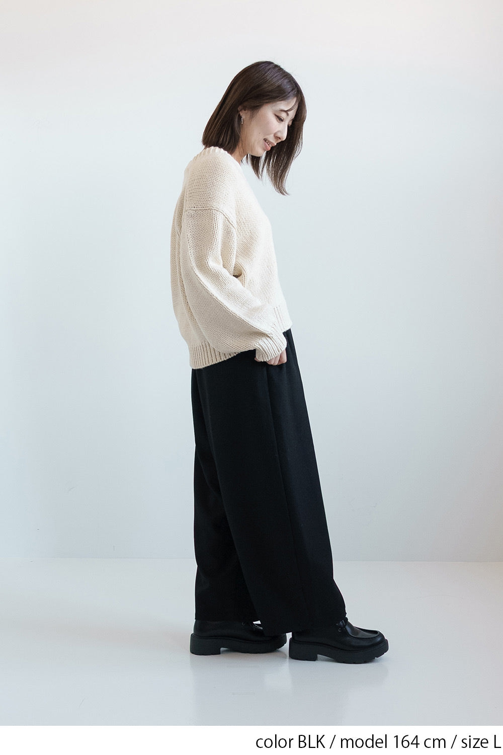 股上が深く、裾に向かって緩やかに細くなるコクーンシルエット。