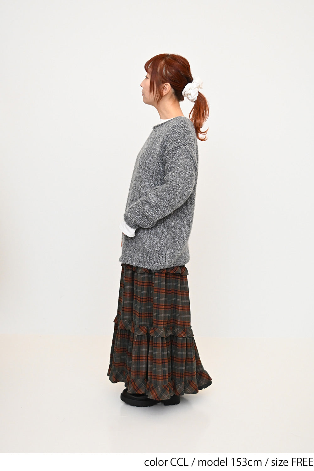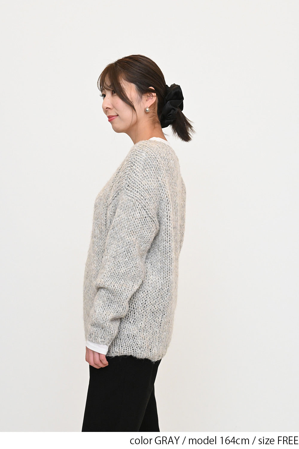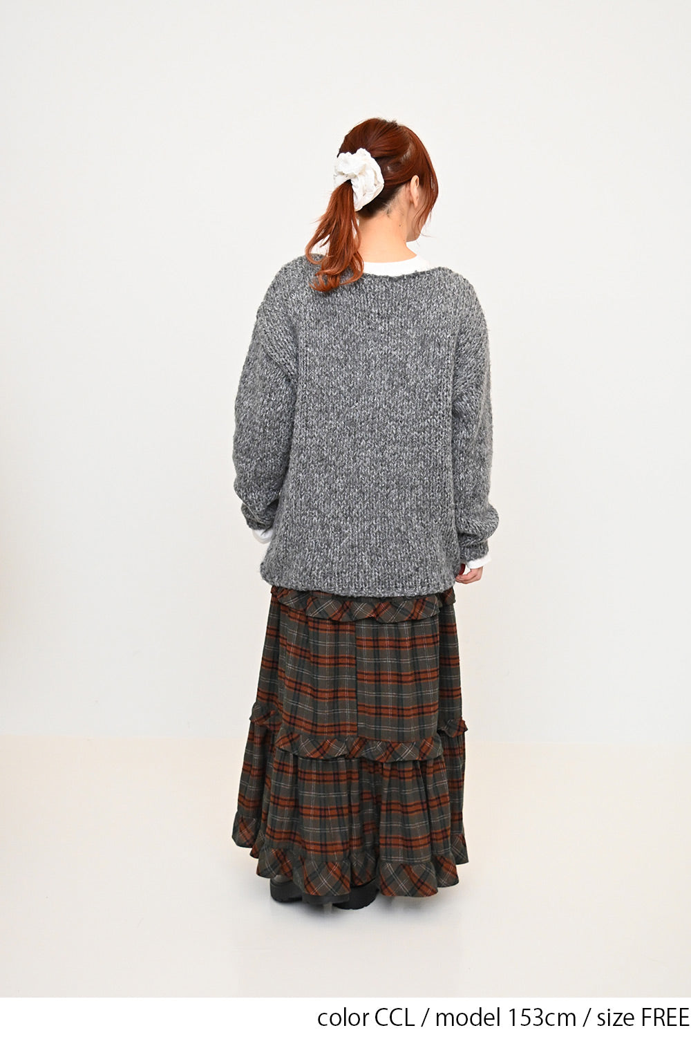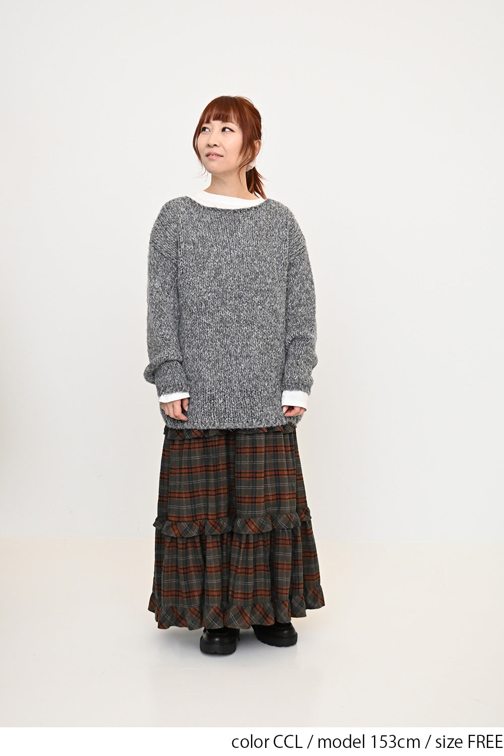 ミックスカラーの糸が奥行きのある表情を作り、透かし編みがコーデに柔らかさと抜け感をプラスします。