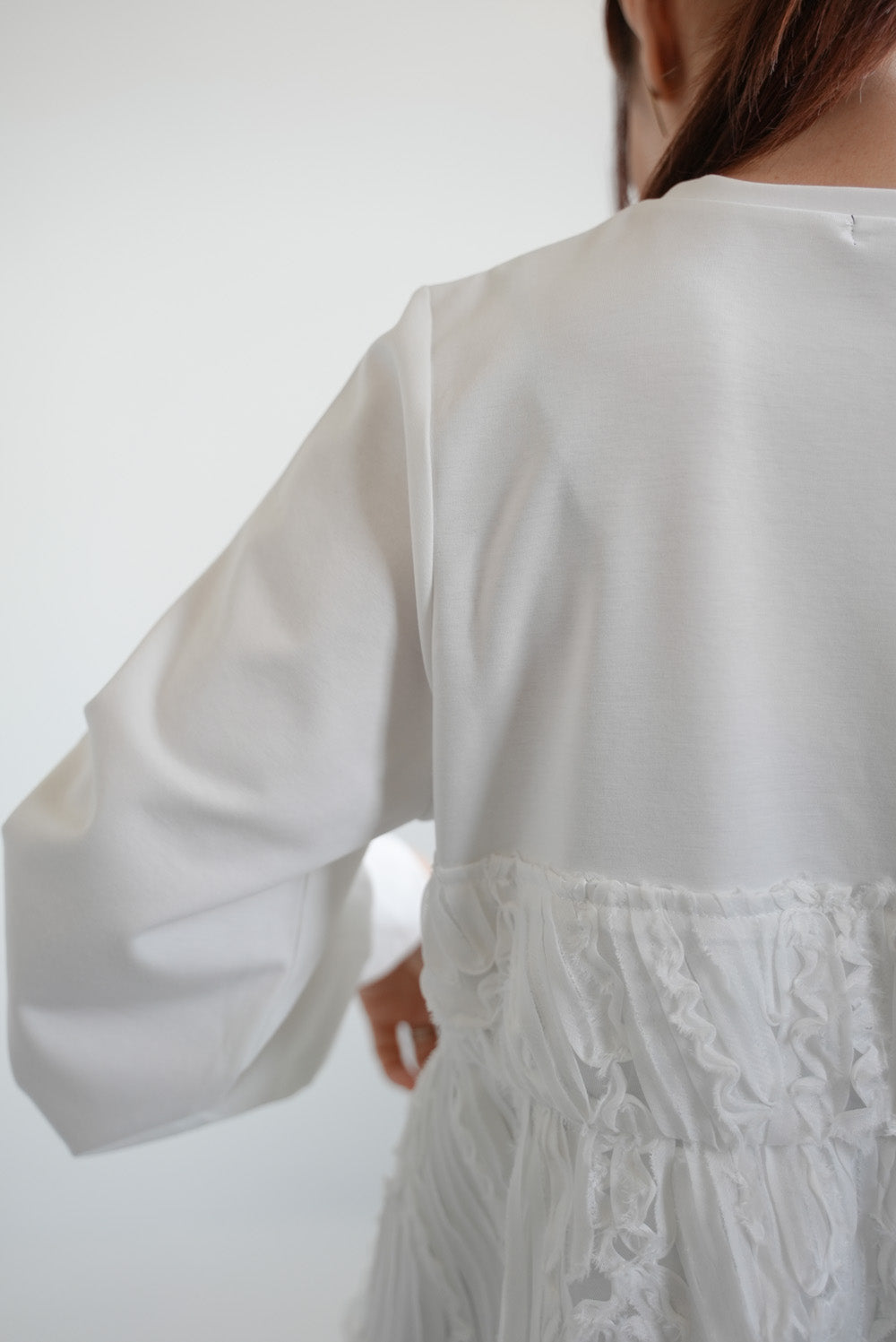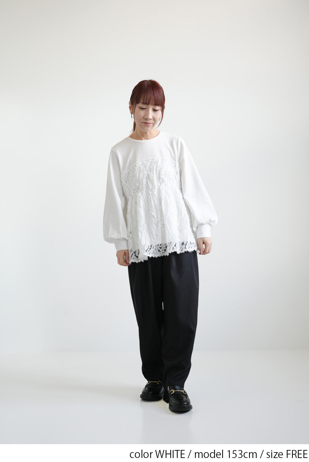 バスト下でさりげなく絞ったシルエットが、体のラインを拾いすぎずスッキリとした印象に。