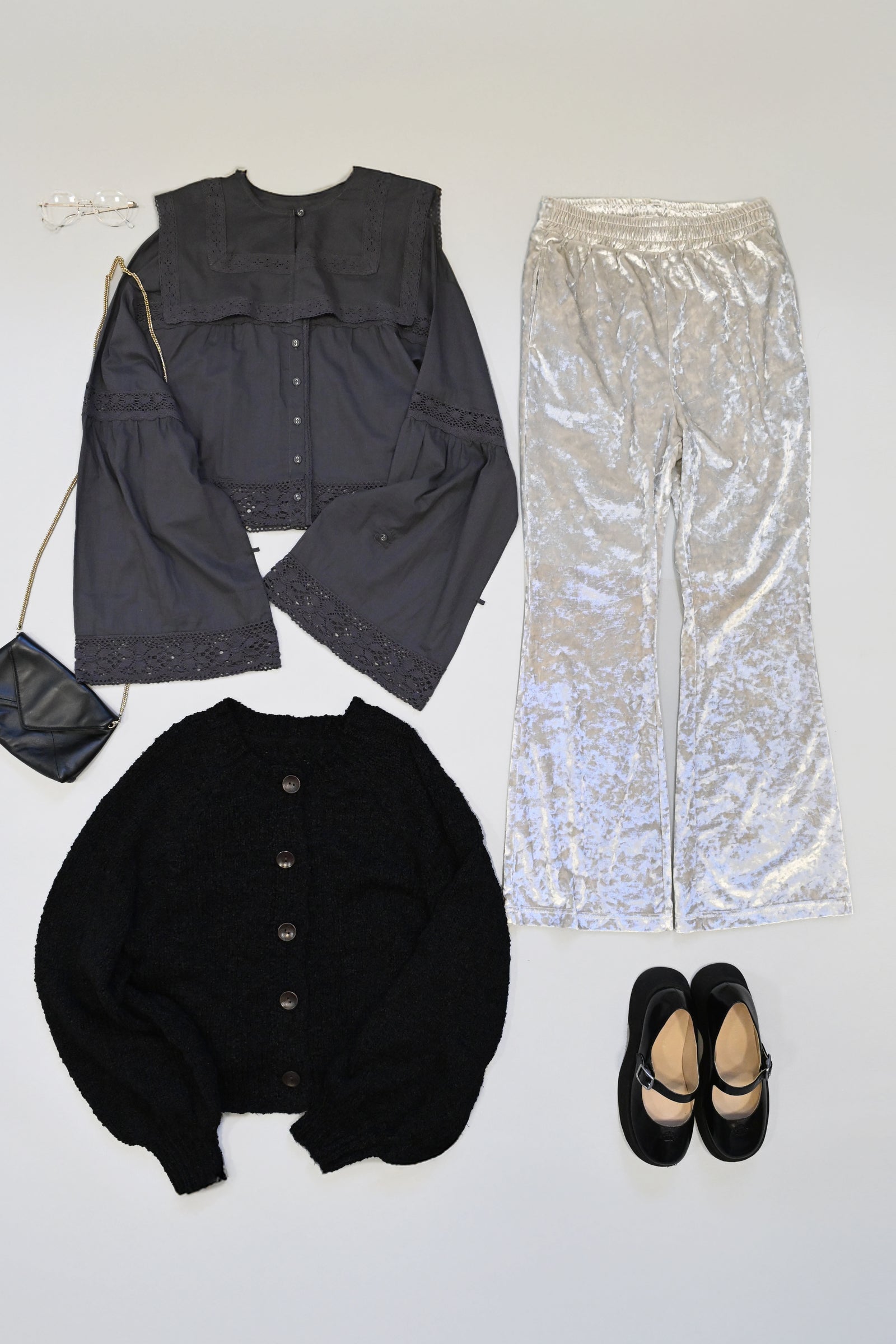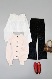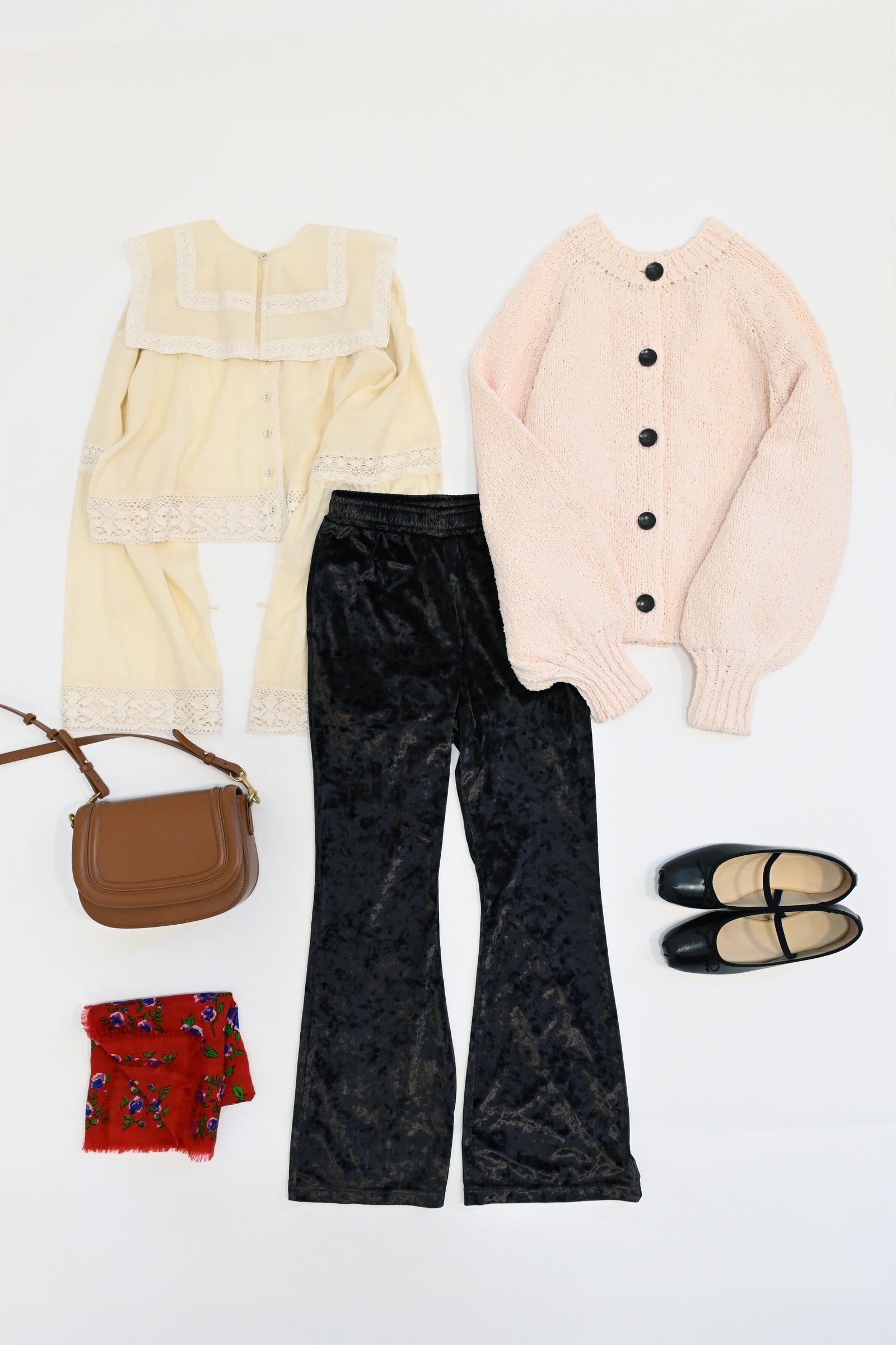 | 素材 | ■付け衿ブラウス 綿 100% ■ベロアフレアパンツ 本体:ポリエステル 95%、ポリウレタン 5% 別地:ポリエステル 80%、綿 20% ■袖ボリュームカーデ 本体:ポリエステル 100% リブ:ポリエステル 93%、ナイロン 3% |