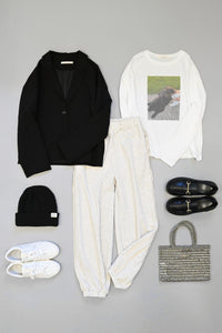 | 素材 | ■フォトTEE ポリエステル 100% ■ジャケット 表地:ポリエステル 72%、レーヨン 15%、ポリウレタン 4%、 毛 3%、再生繊維(セルロース) 3%、アクリル 3% 裏地:ポリエステル 100% ■サイドレーススウェットパンツ 本体:綿 80%、ポリエステル 20% レース:綿 100% |