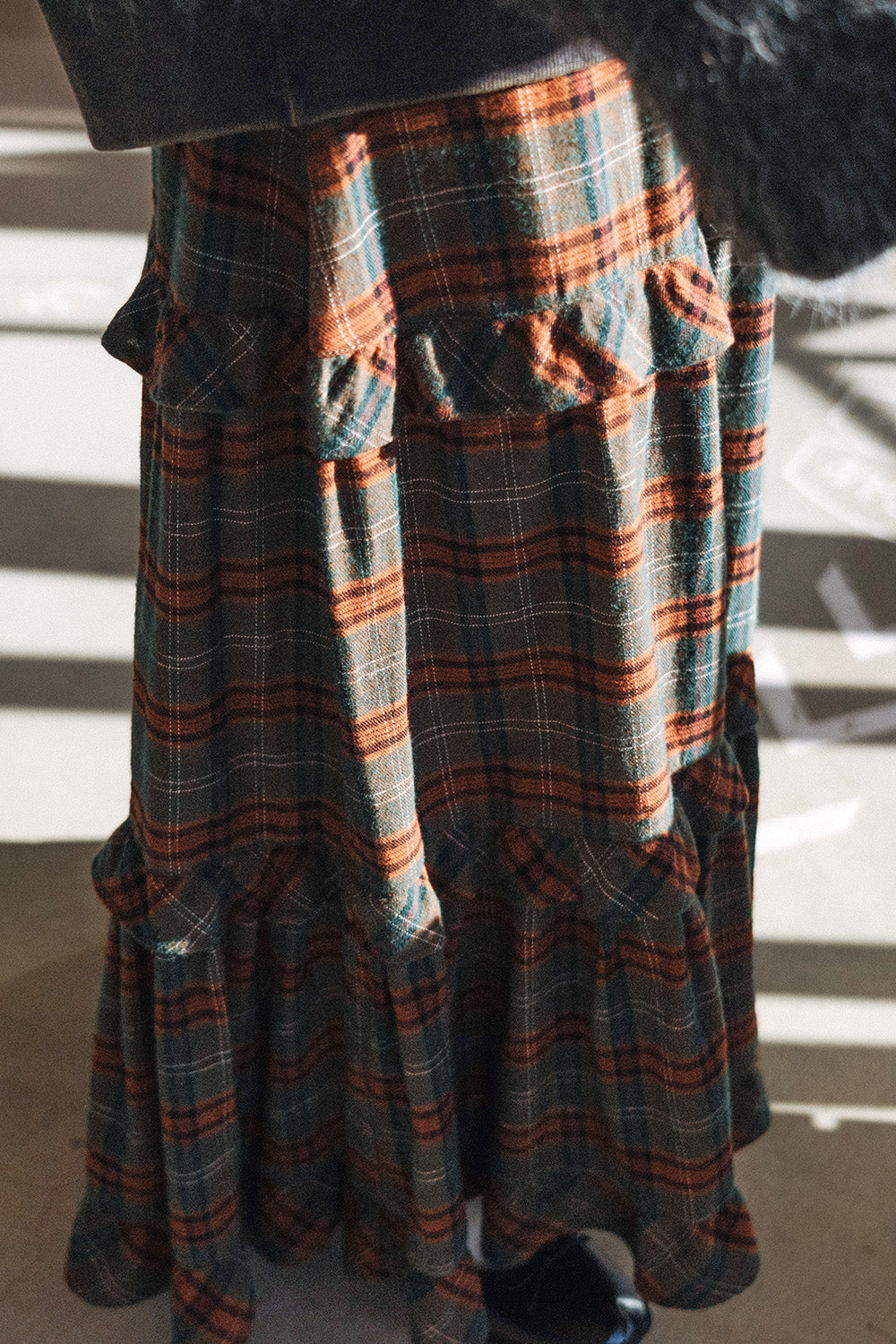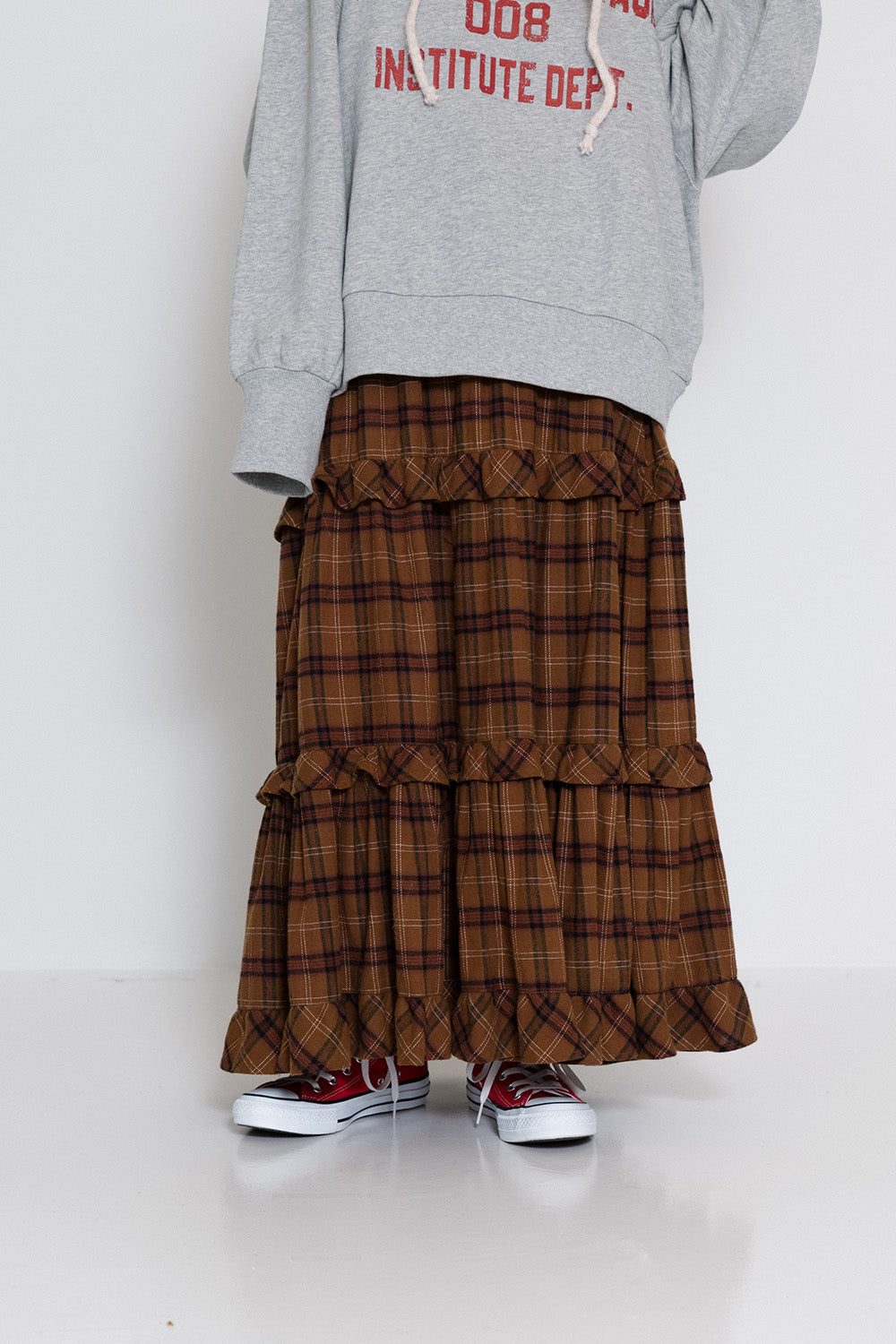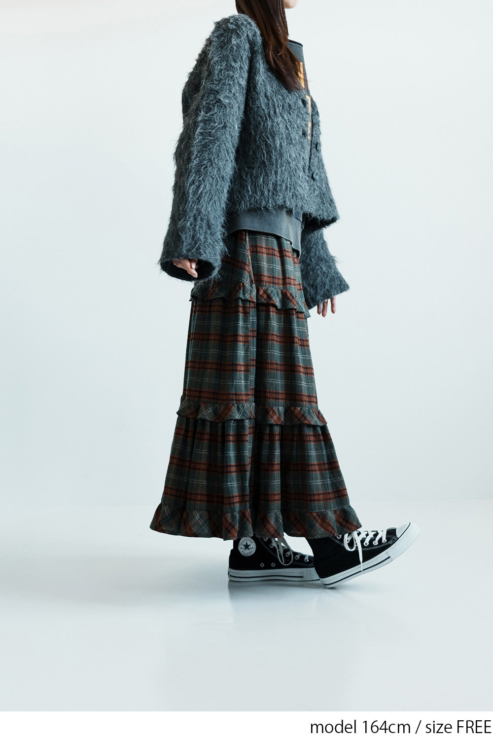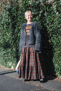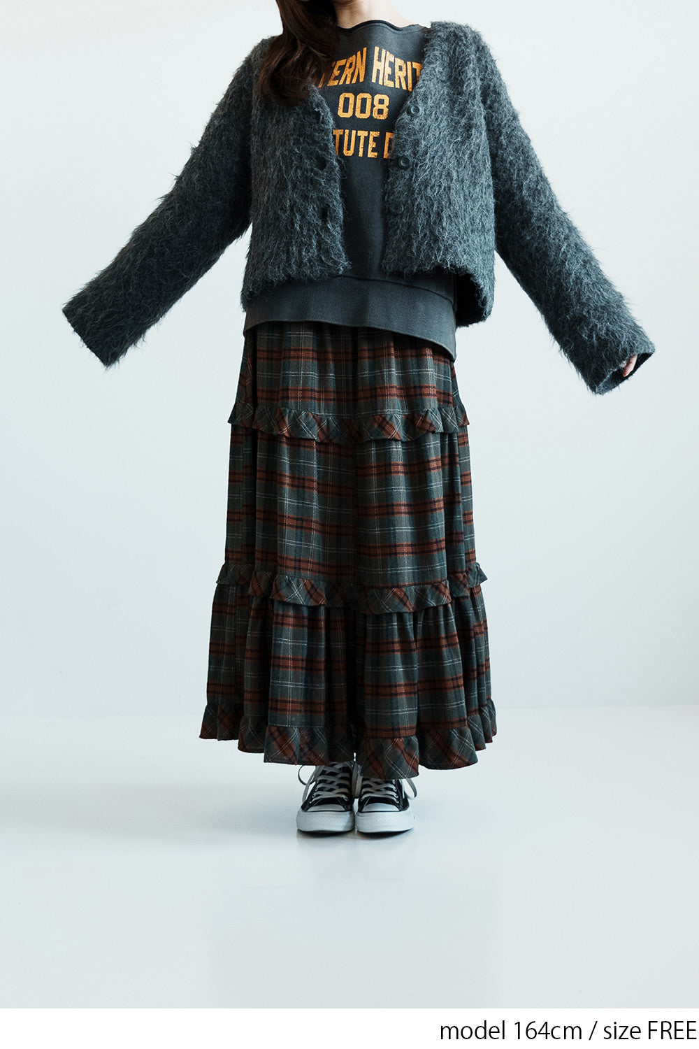 ボリューム感のあるチェックスカートがアクセントに。