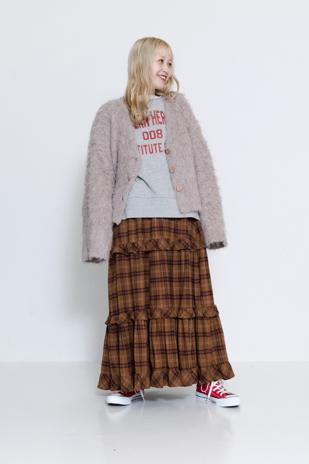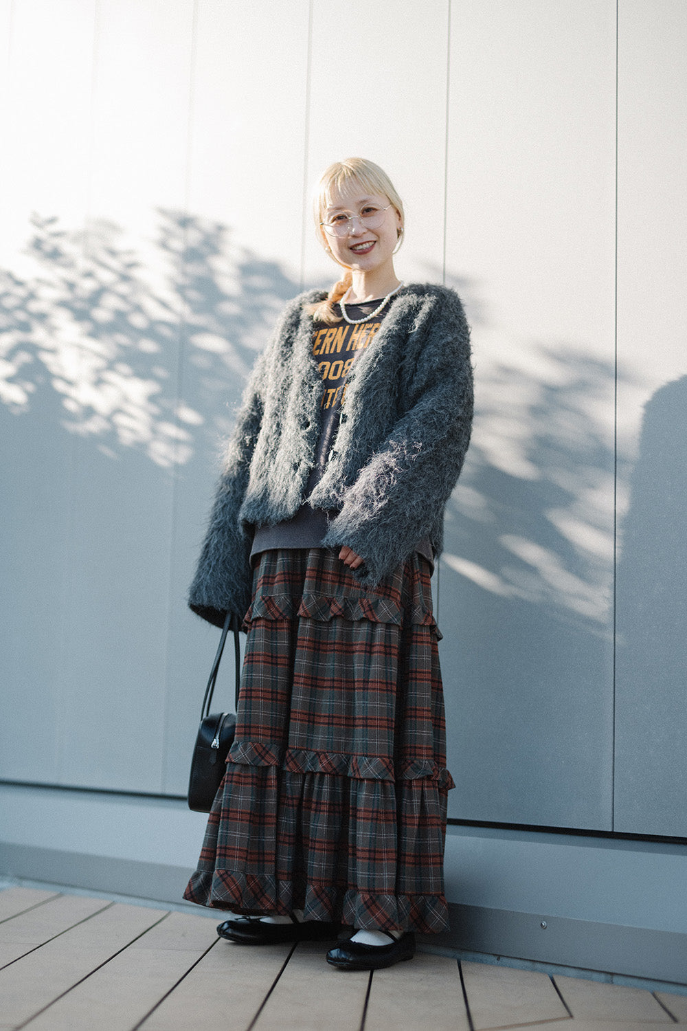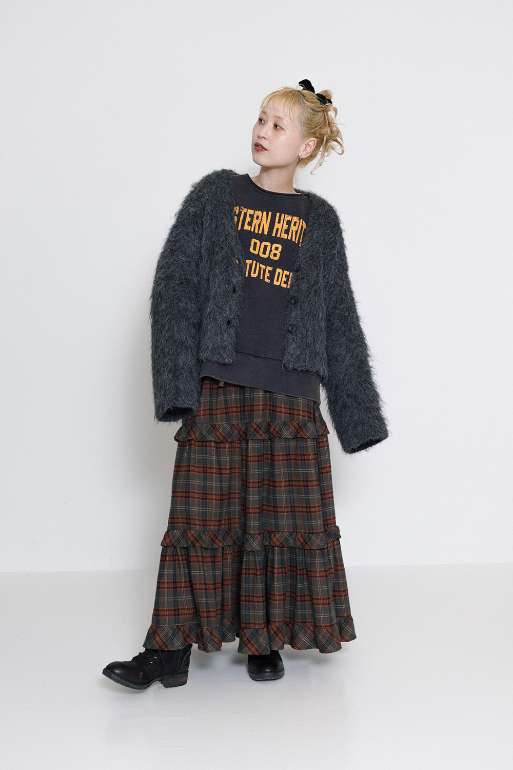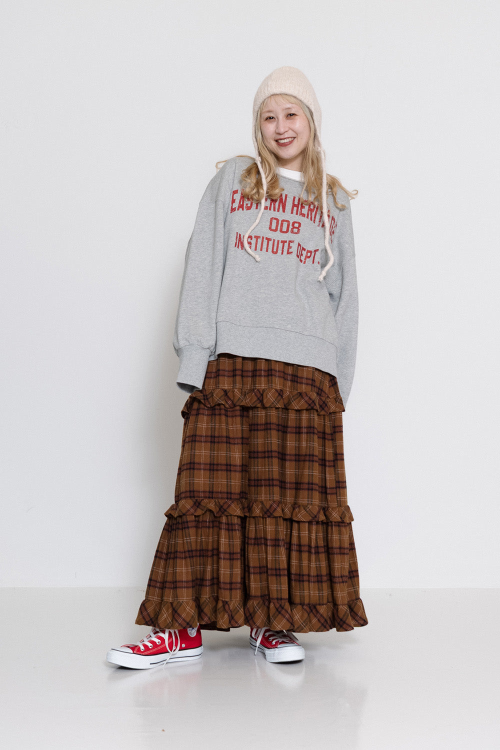 ボリューム感のあるチェックスカートがアクセントに。
