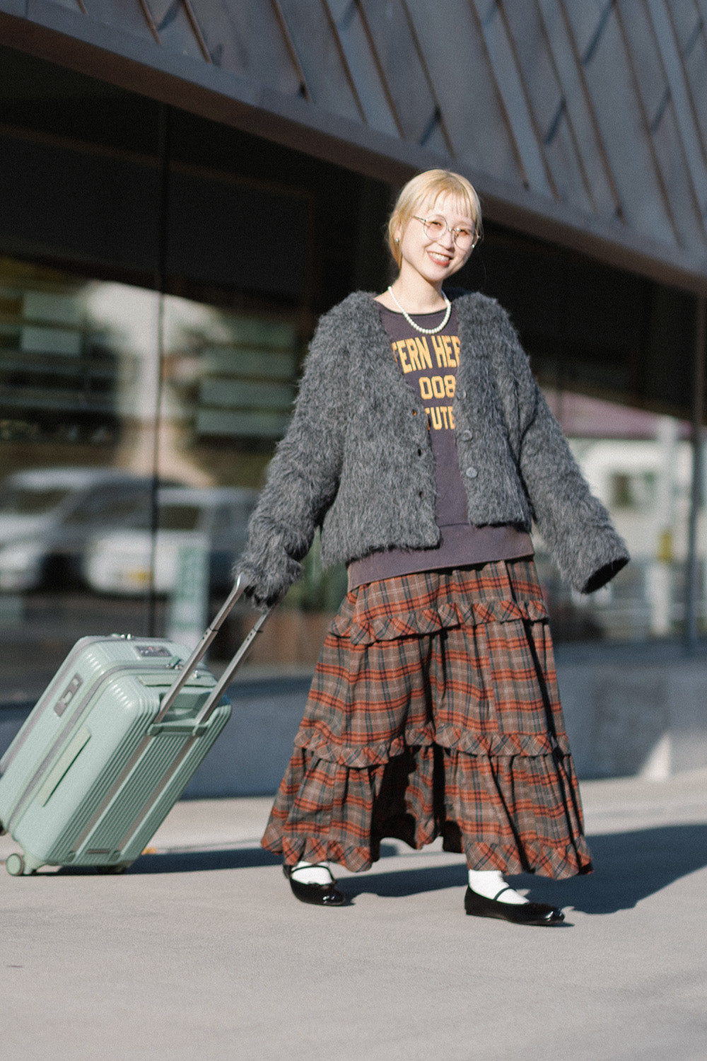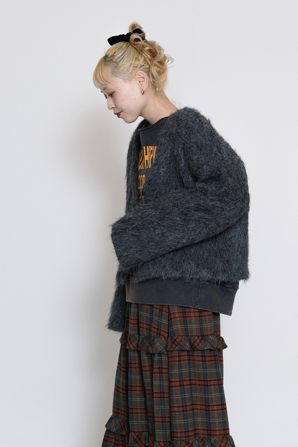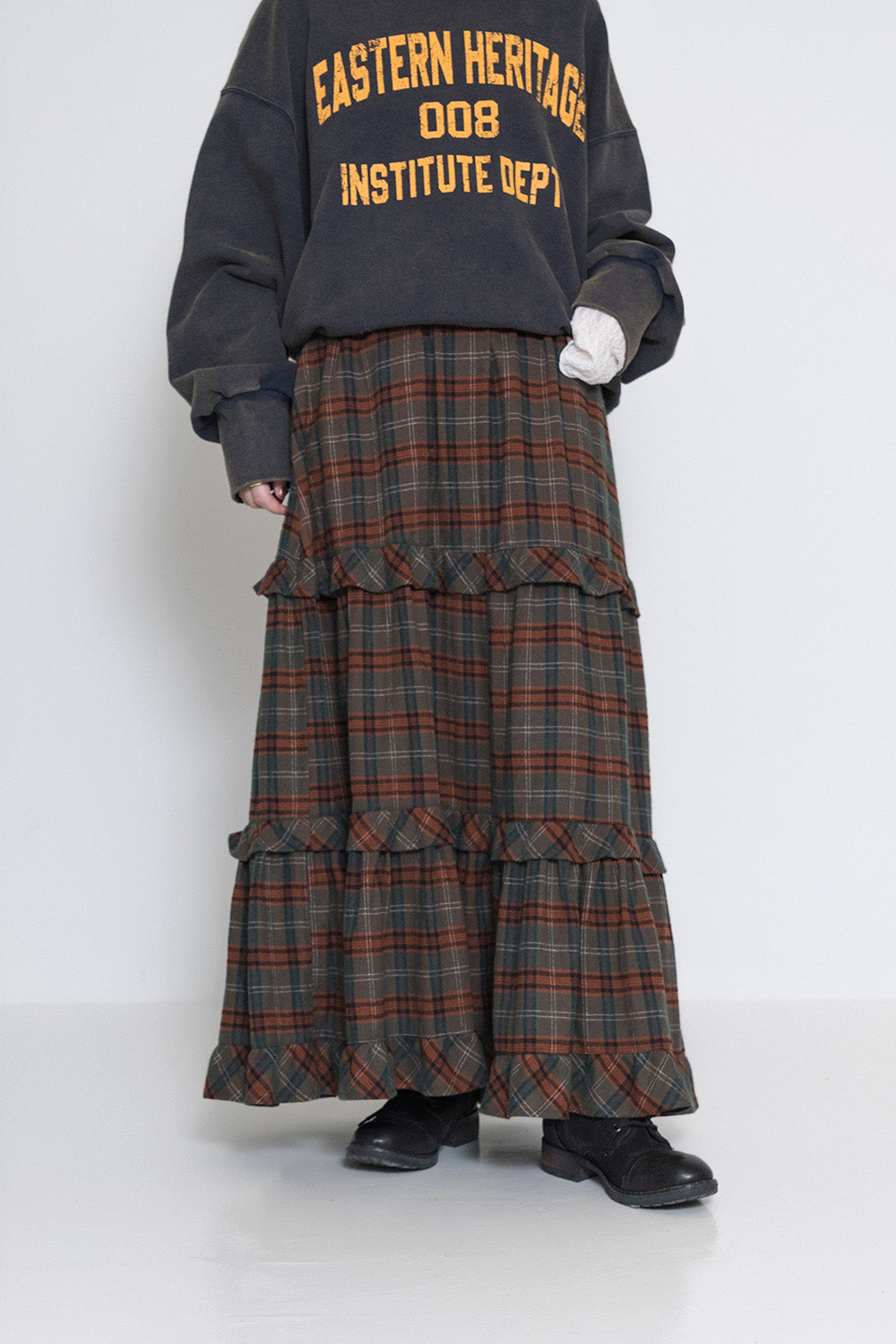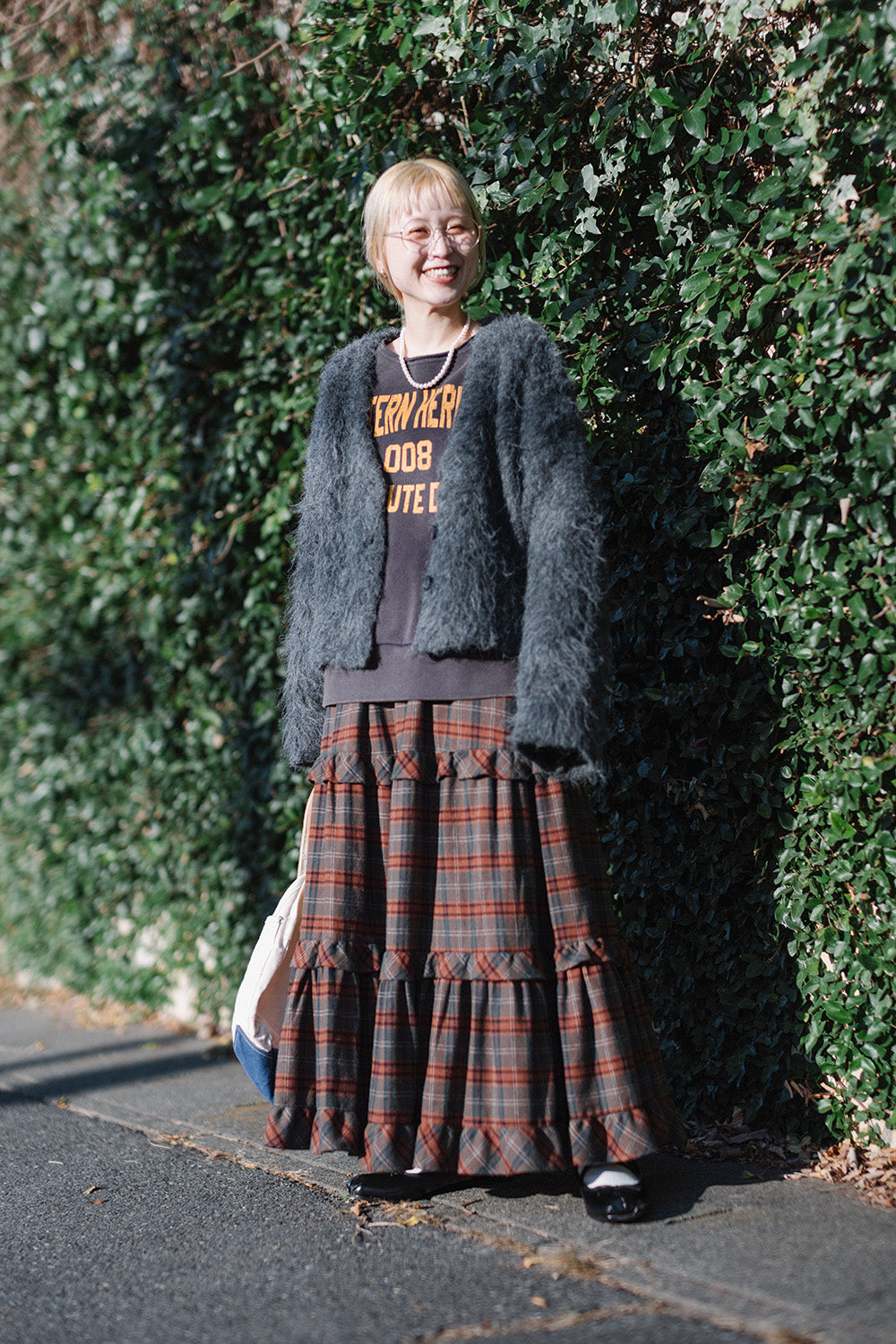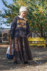 ボリューム感のあるチェックスカートがアクセントに。