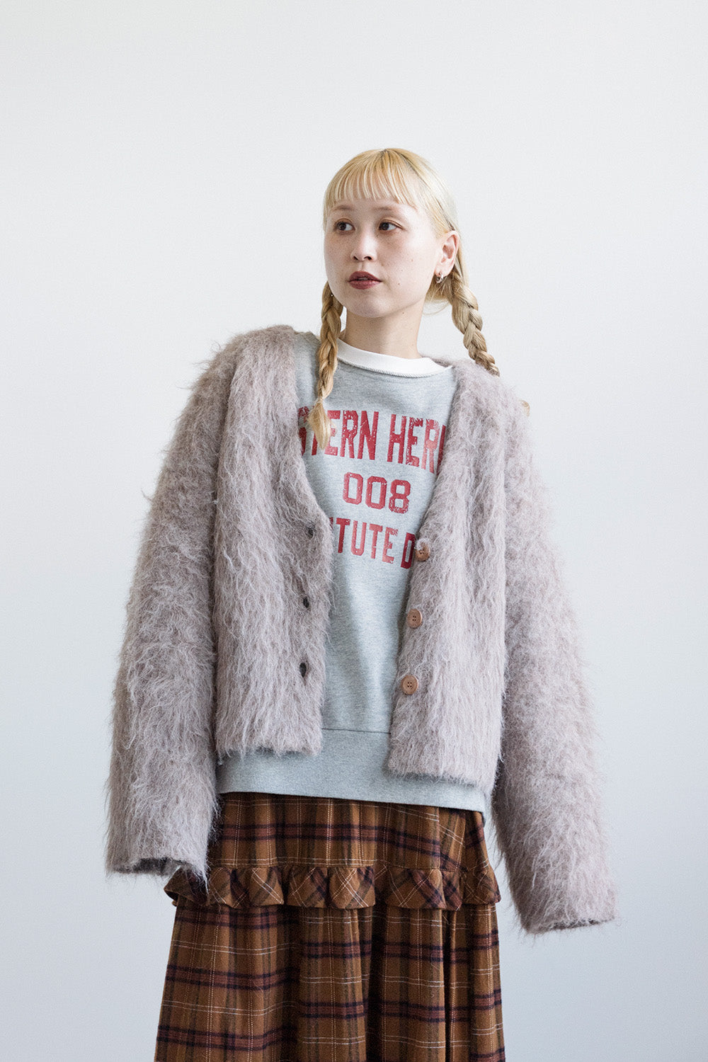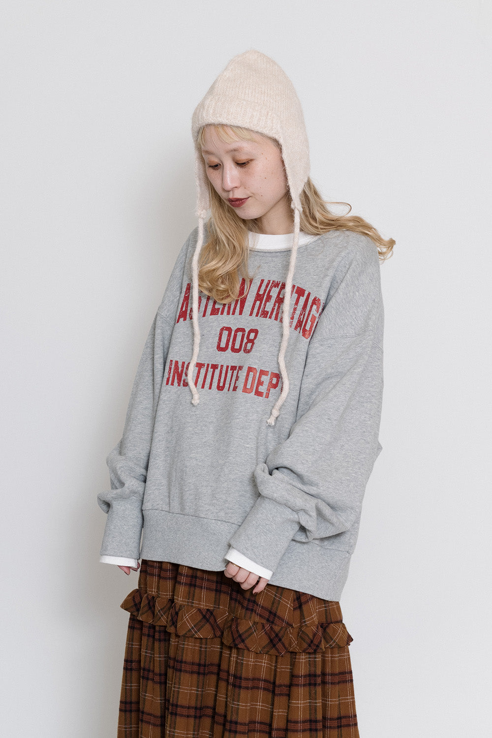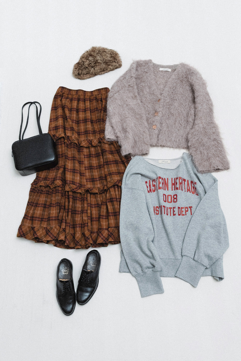 | 素材 | ■カレッジロゴトレーナー 本体:綿 100% リブ:綿 97%、ポリウレタン 3% ■ティアードボリュームスカート 綿 95%、ポリエステル 5% ■シャギーニットカーディガン ポリエステル 68%、ナイロン 23%、毛 8%、ポリウレタン 1% |