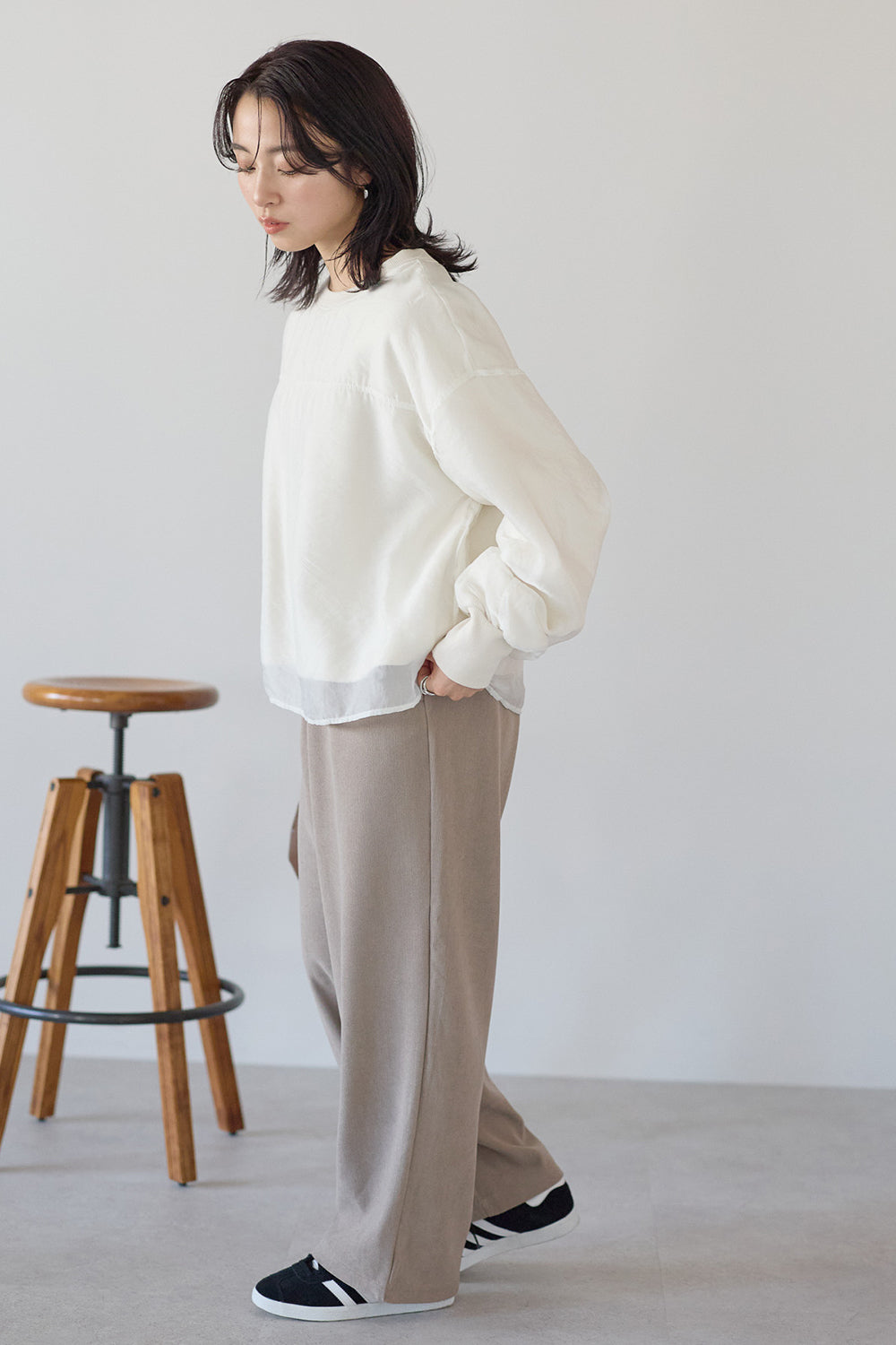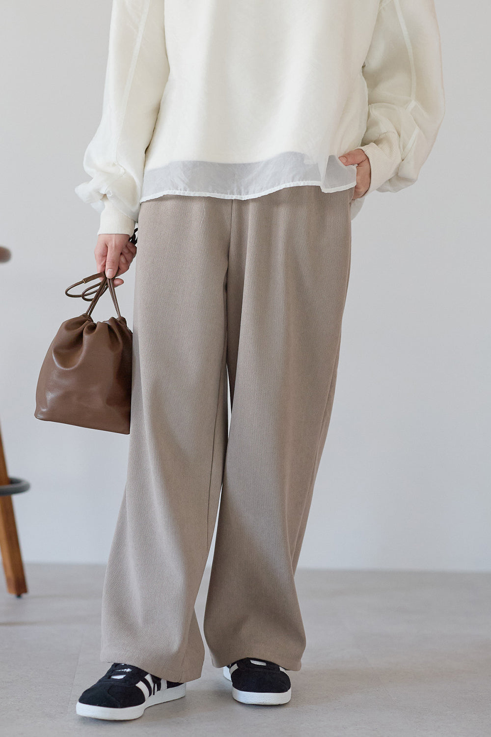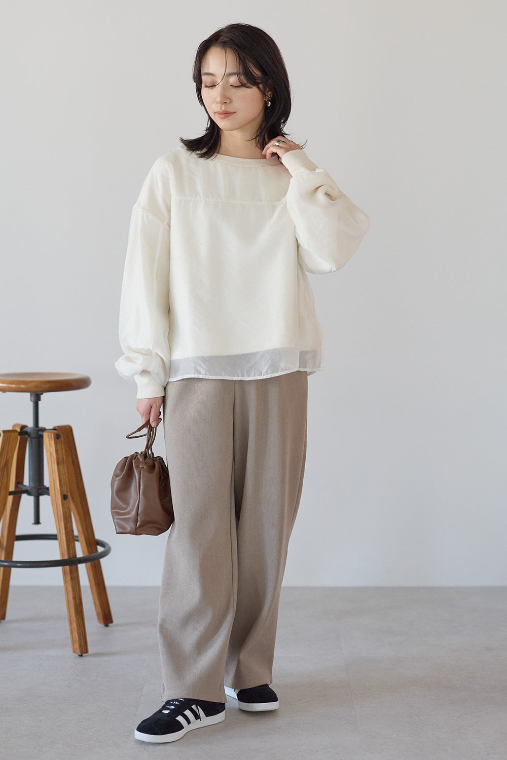 ほどよくゆとりのあるワイドシルエットが脚のラインを拾わず、リラックス感のある着こなしを演出します。