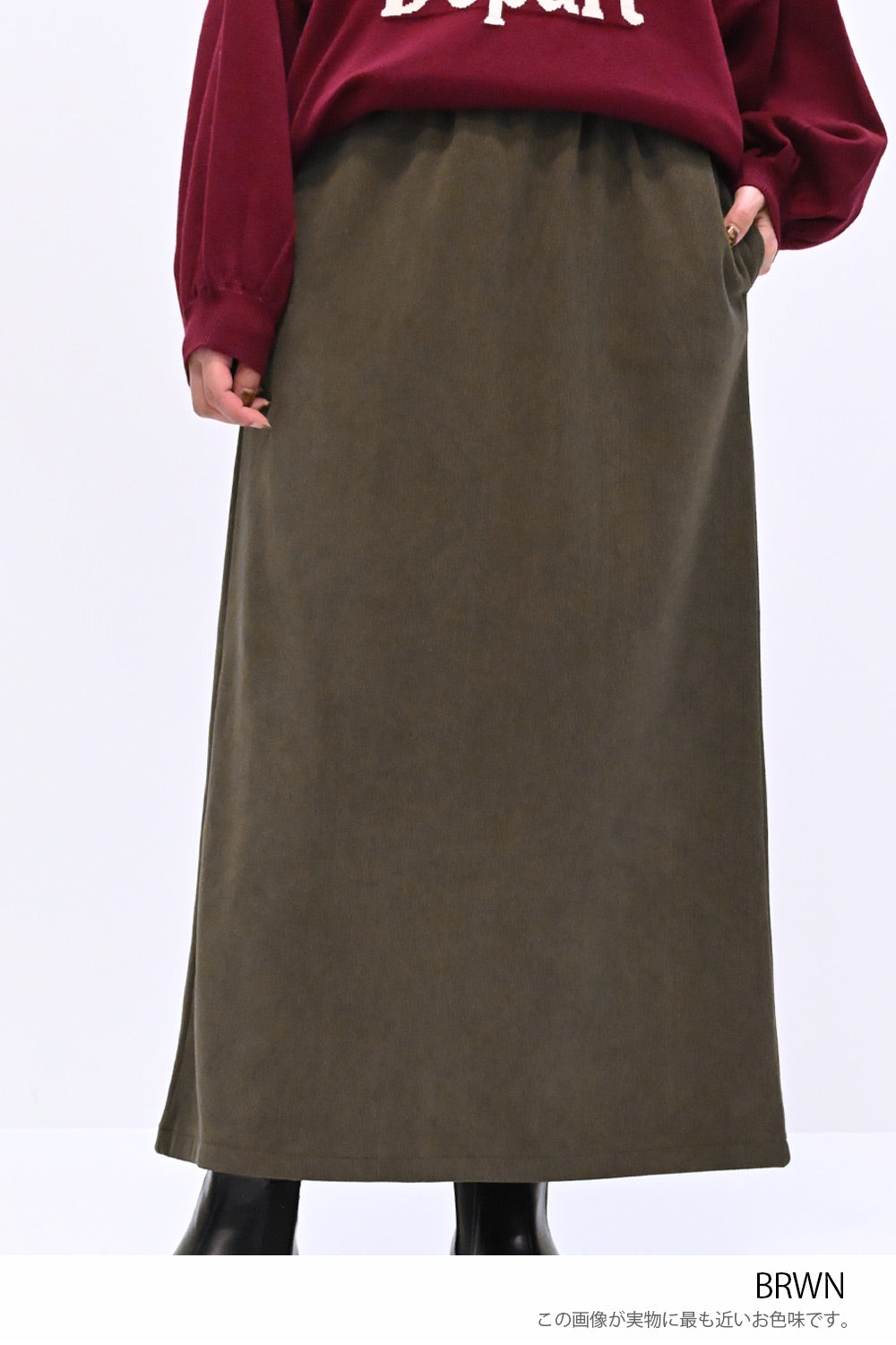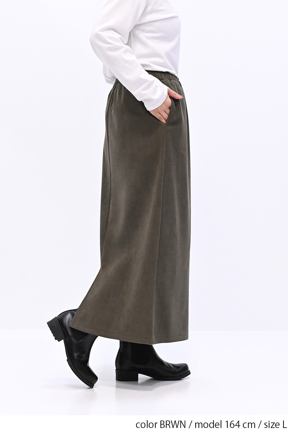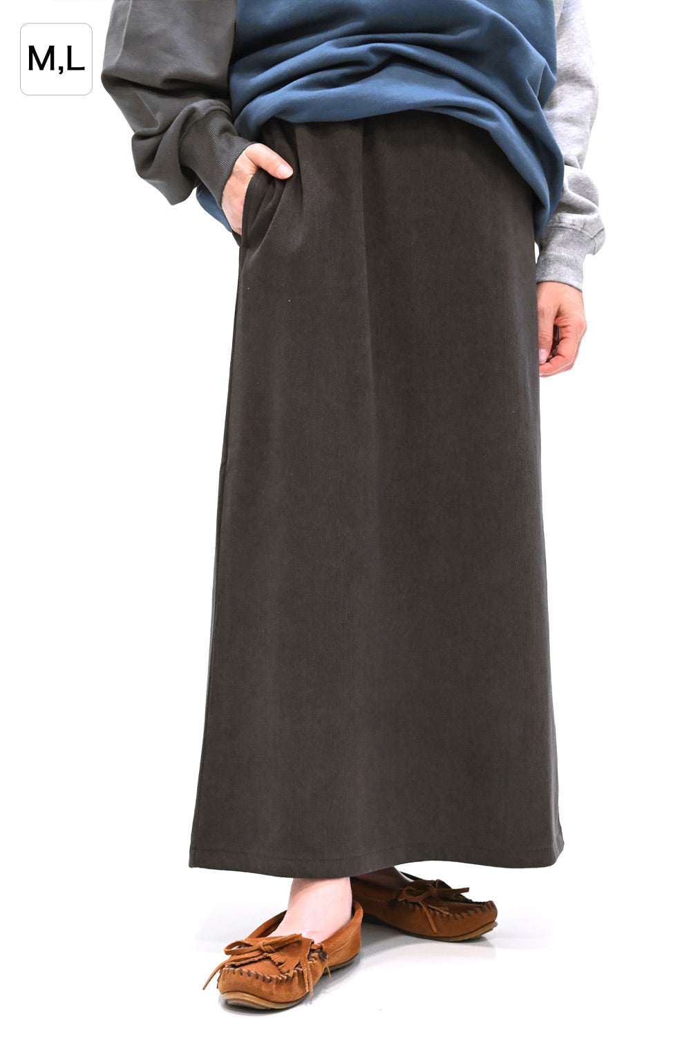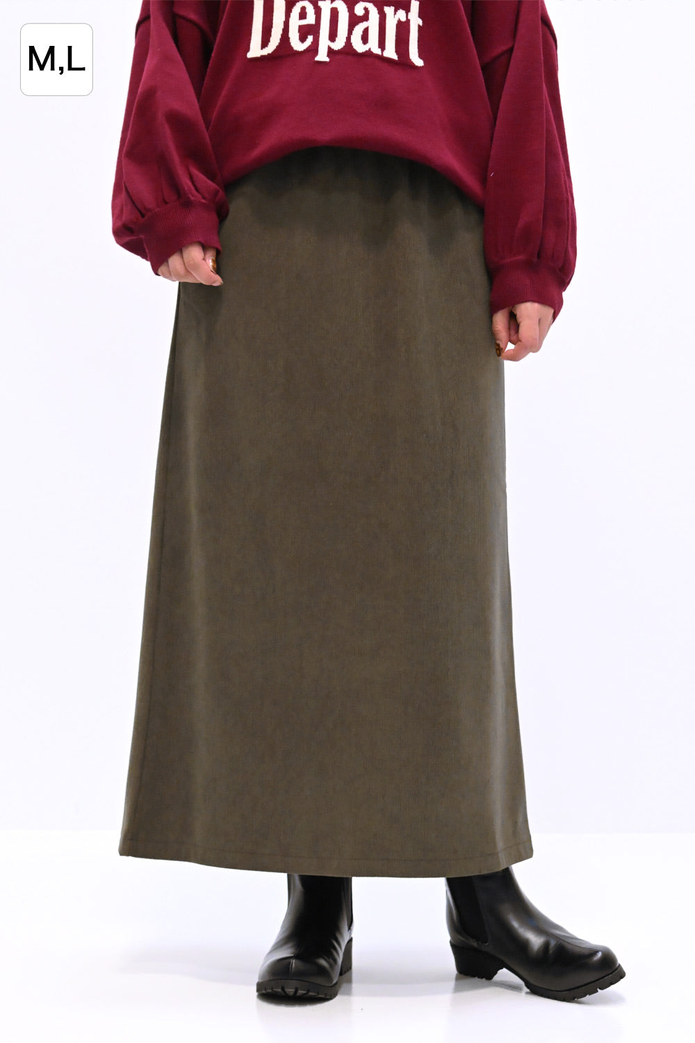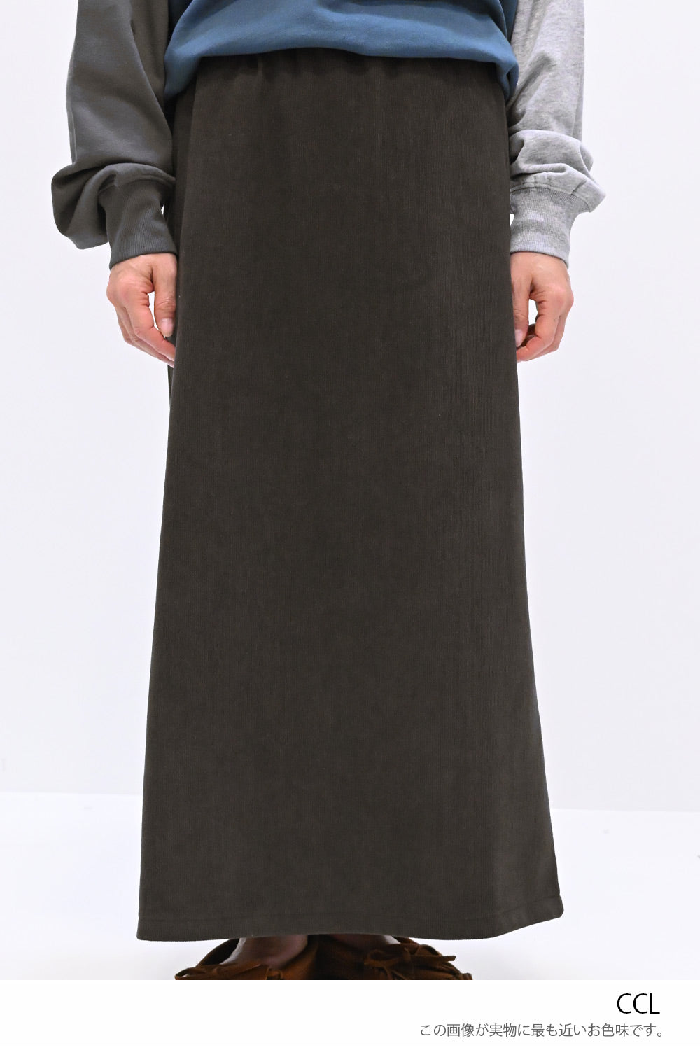 表面は細畝のコーデュロイ、裏面にはふんわりとしたシャギー素材を使用した、季節感たっぷりのロングスカート。