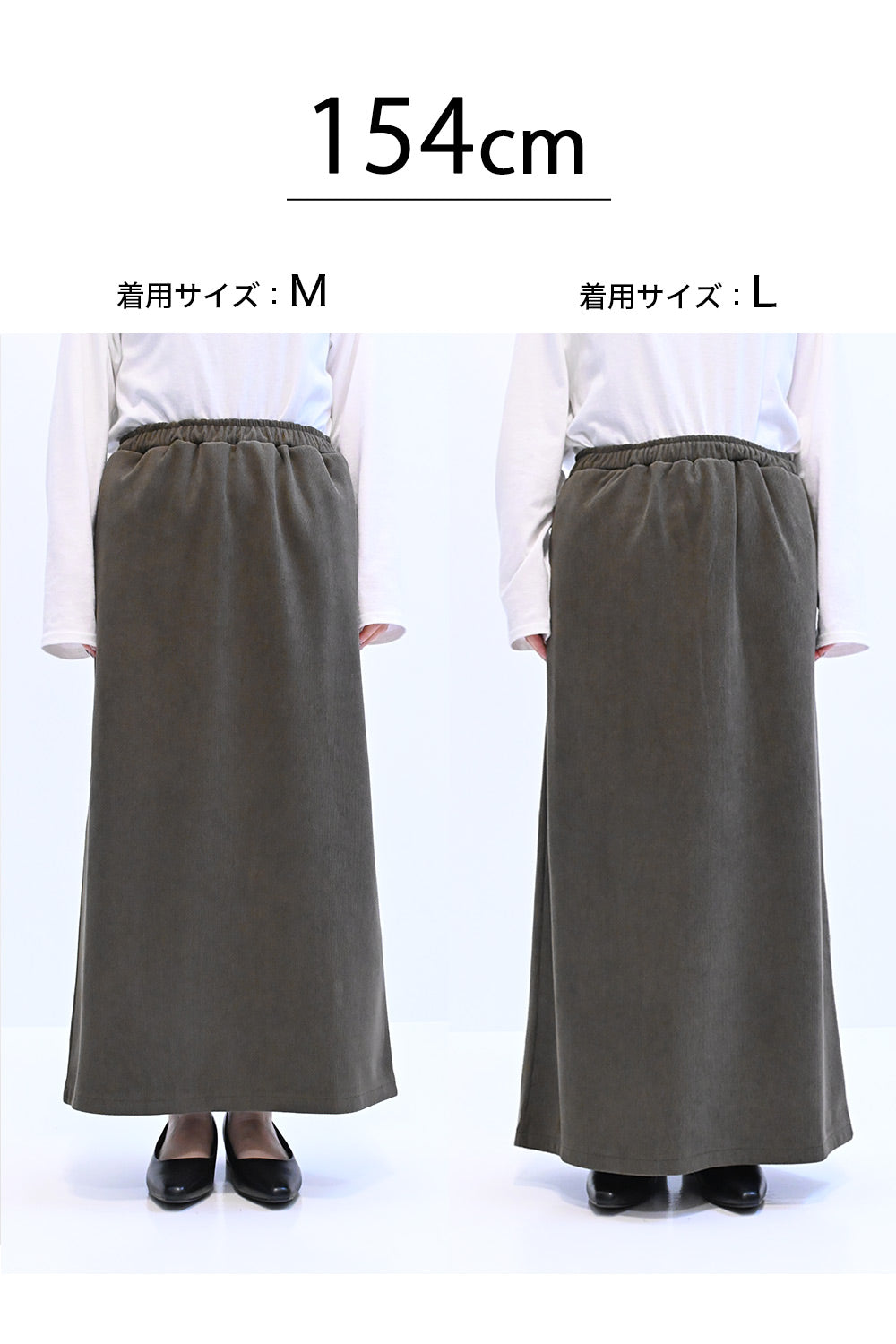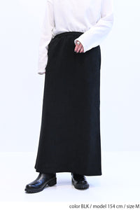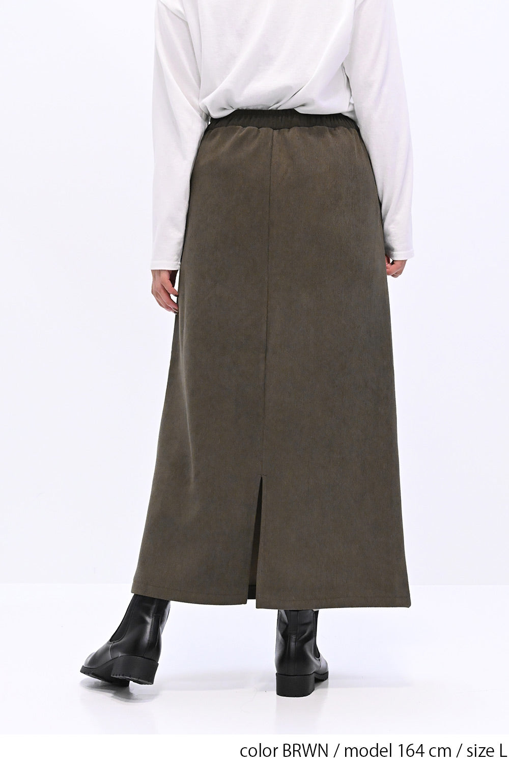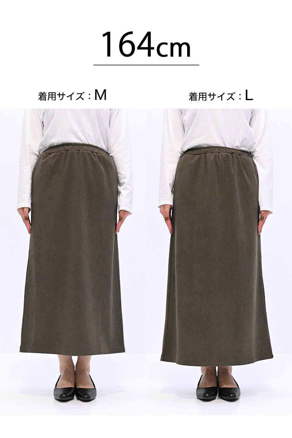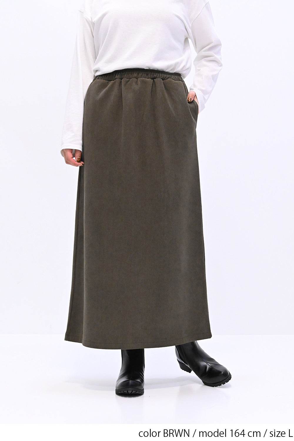 表面は細畝のコーデュロイ、裏面にはふんわりとしたシャギー素材を使用した、季節感たっぷりのロングスカート。