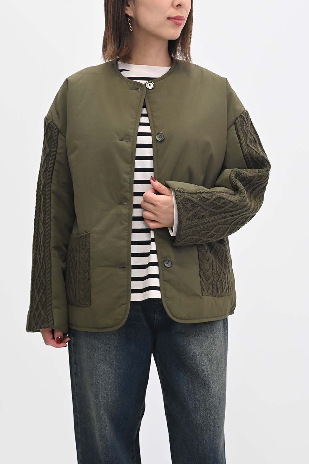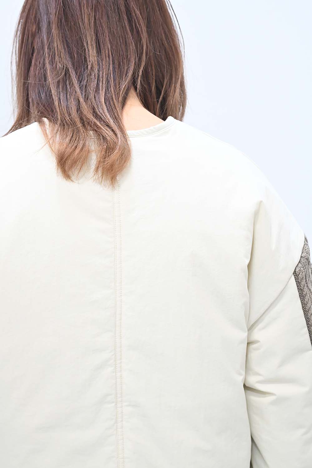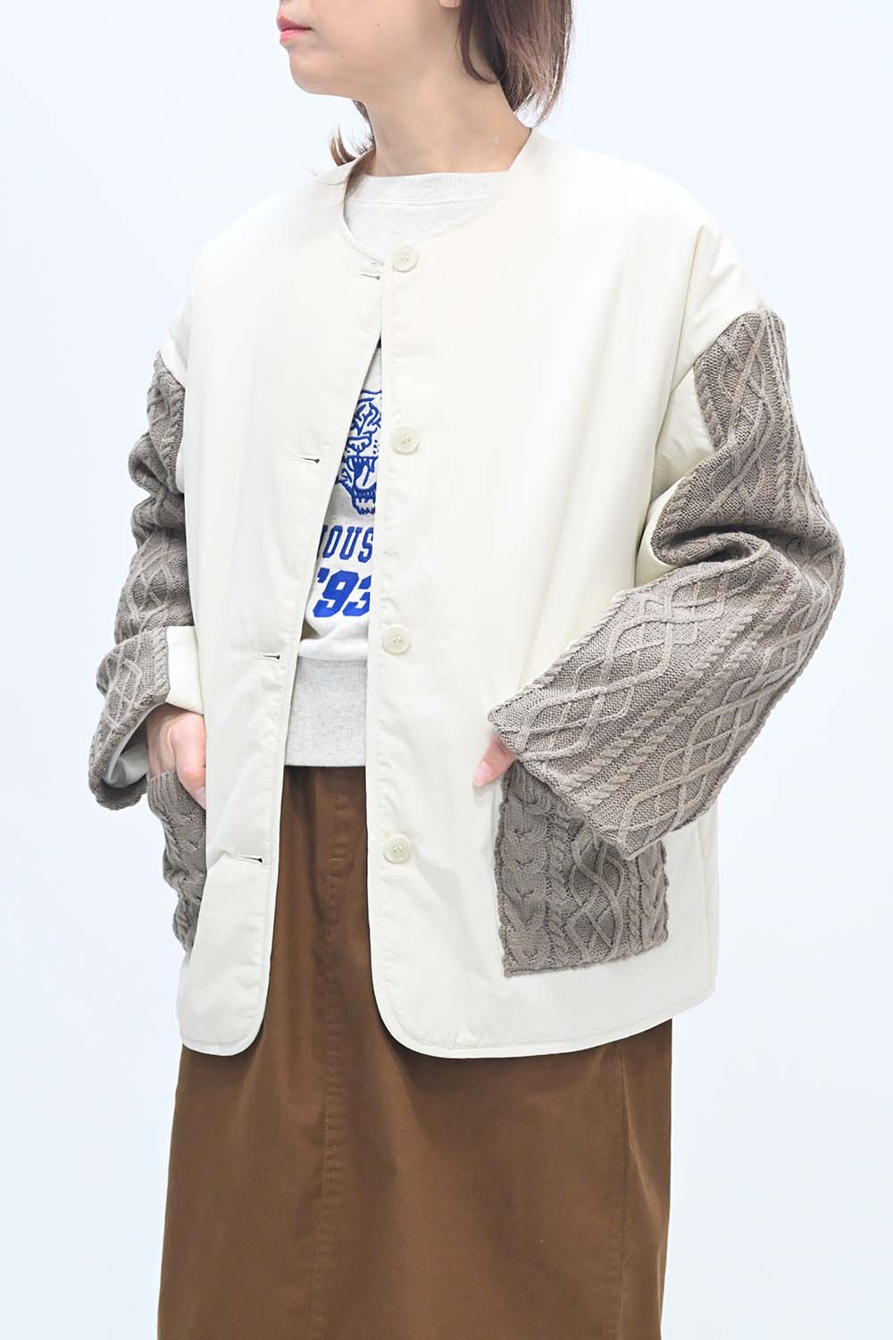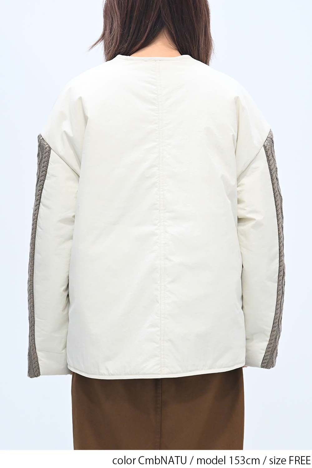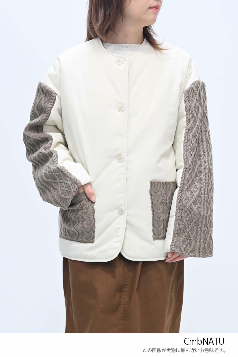 ケーブルのニットと、ナイロン生地の中綿を切り替えたアウターです。