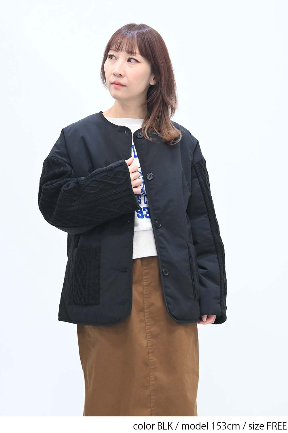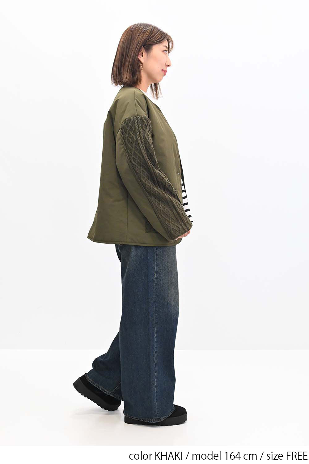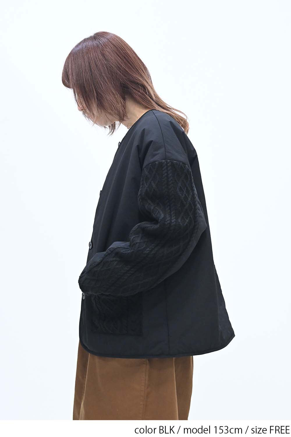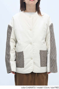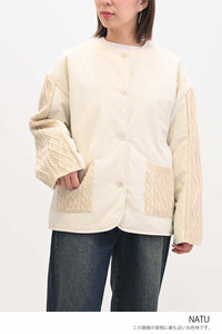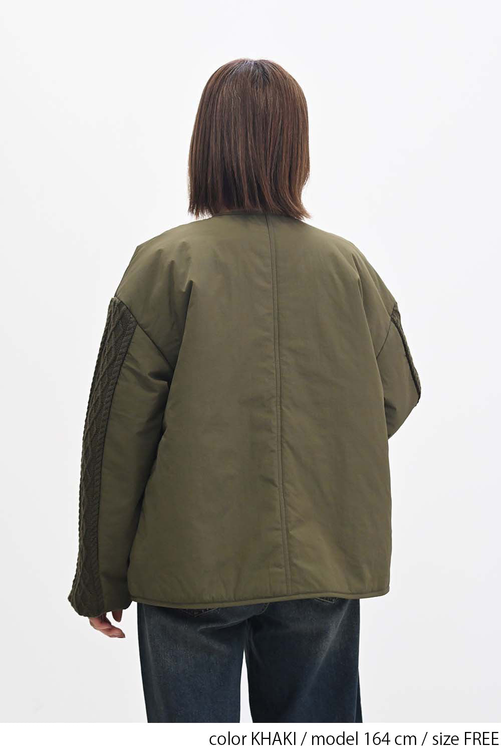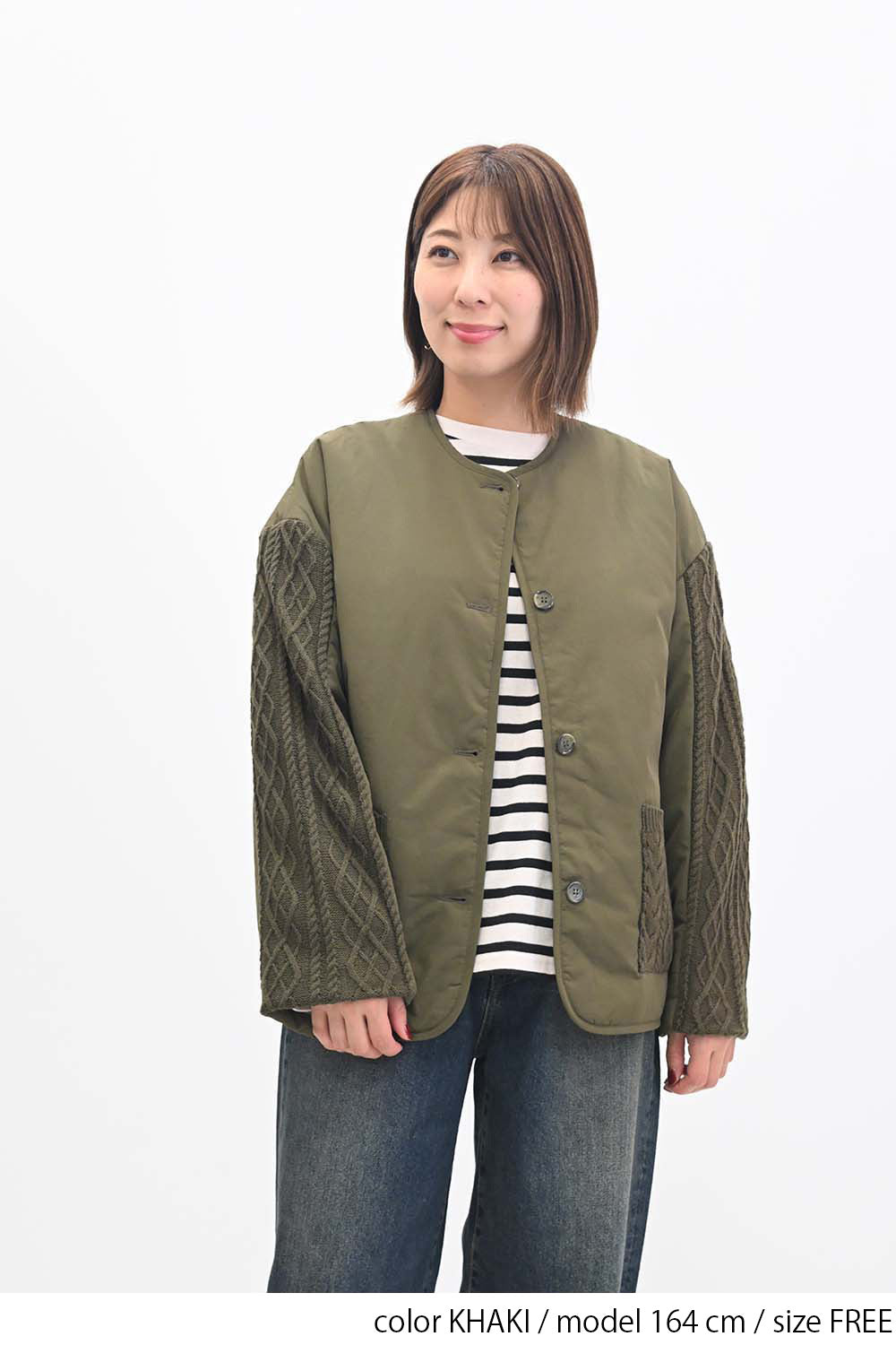 ケーブルのニットと、ナイロン生地の中綿を切り替えたアウターです。