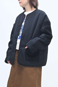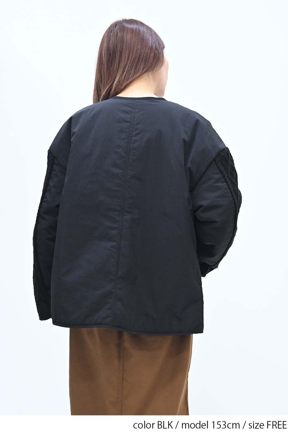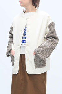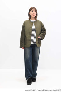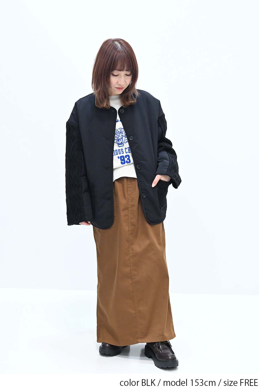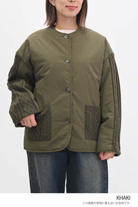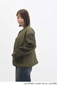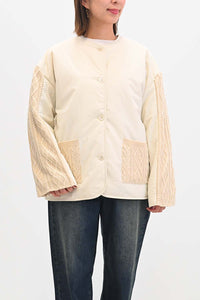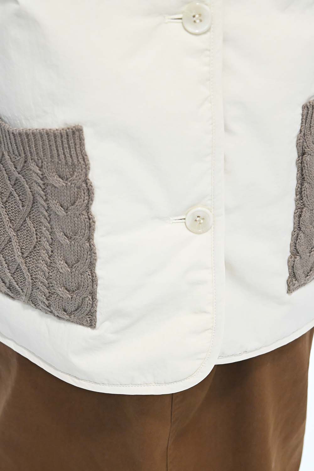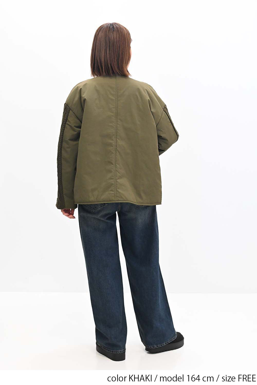 ケーブルのニットと、ナイロン生地の中綿を切り替えたアウターです。