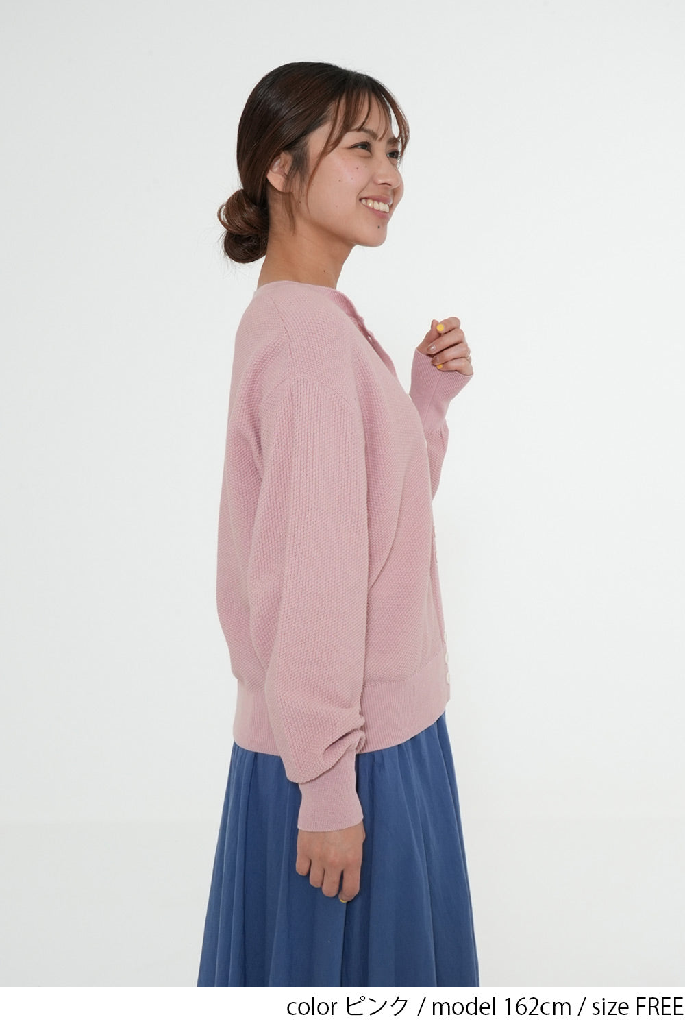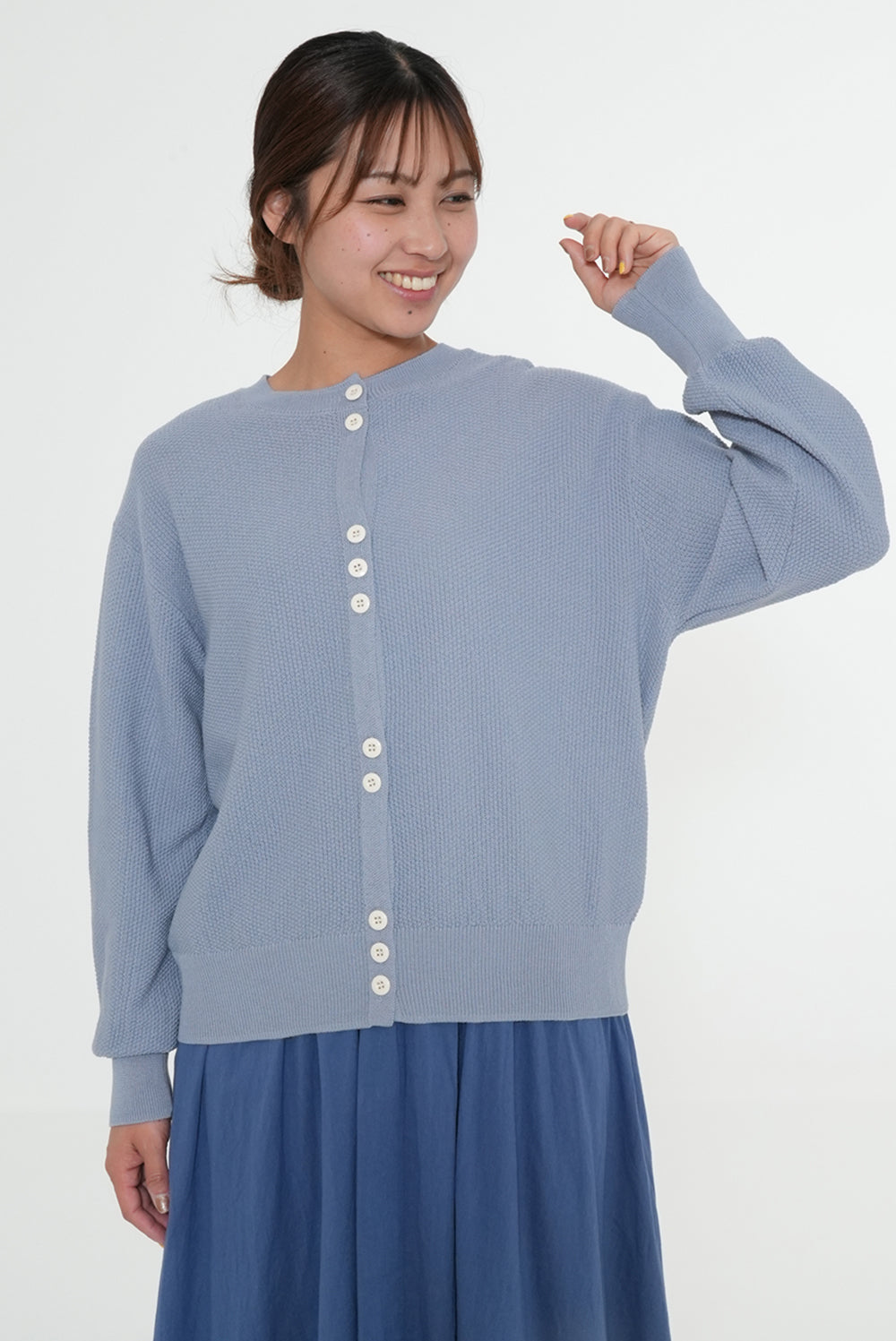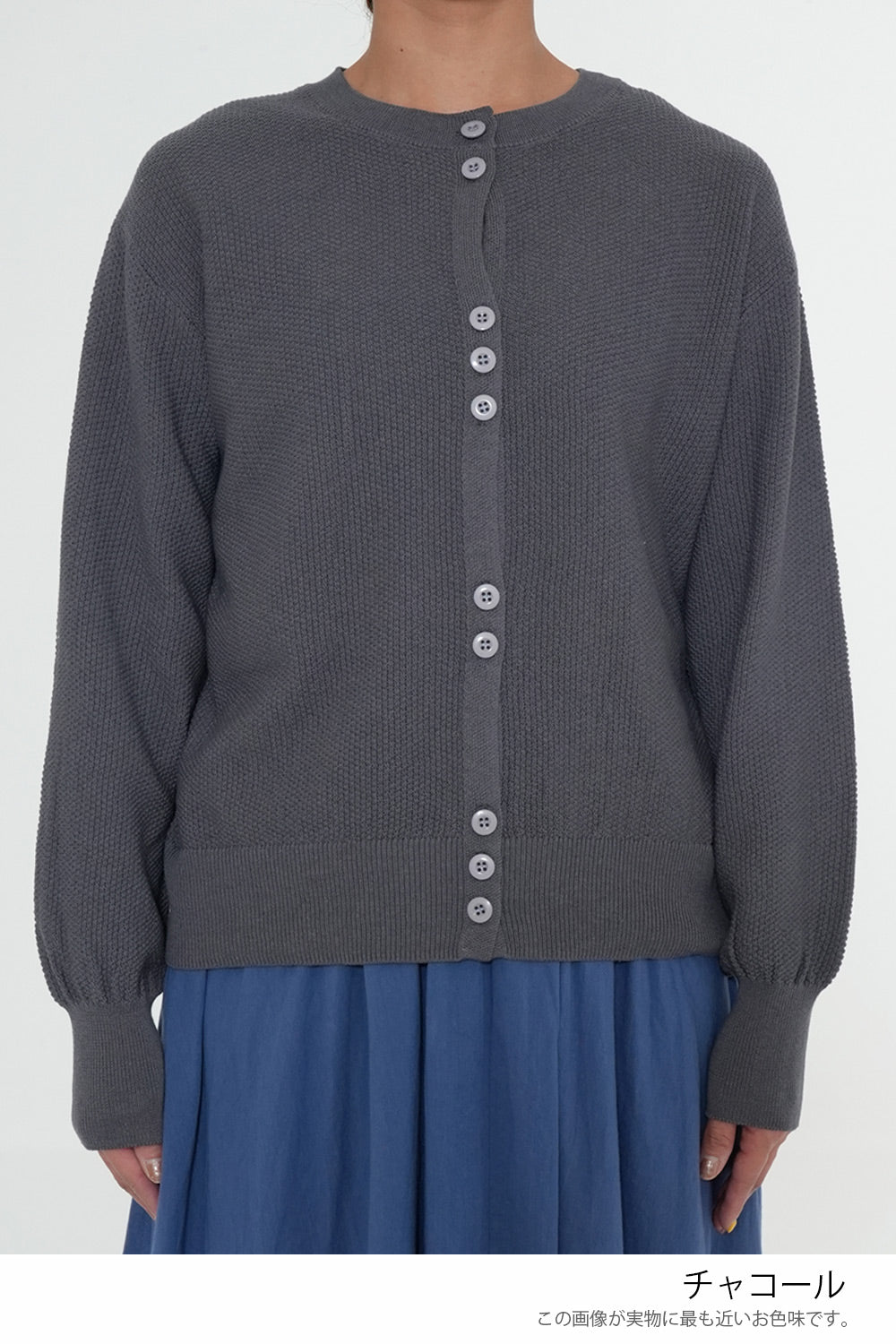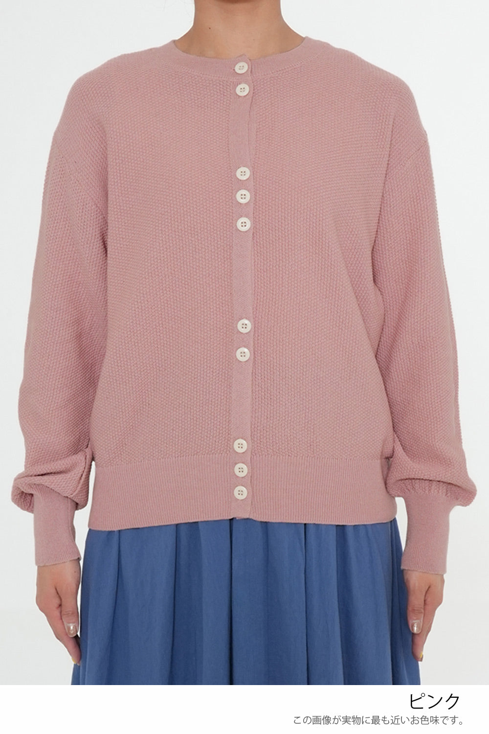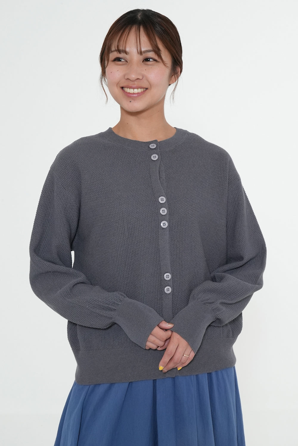 凹凸のあるカノコ編みで、表情豊かに仕上げたクルーネックカーディガン。