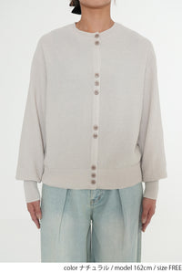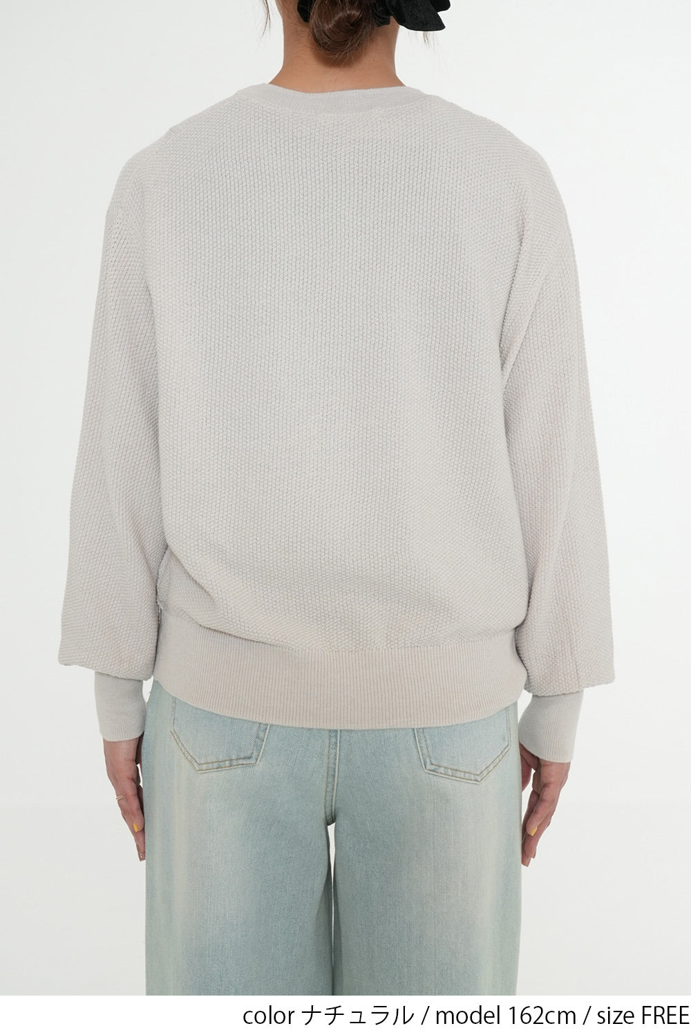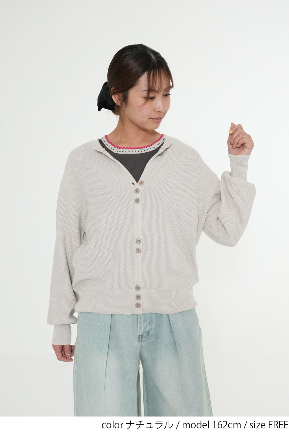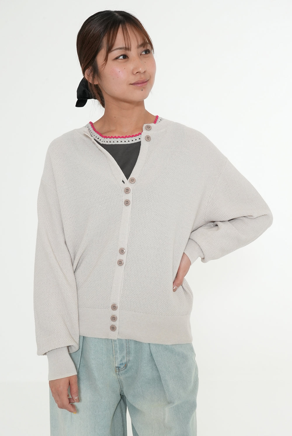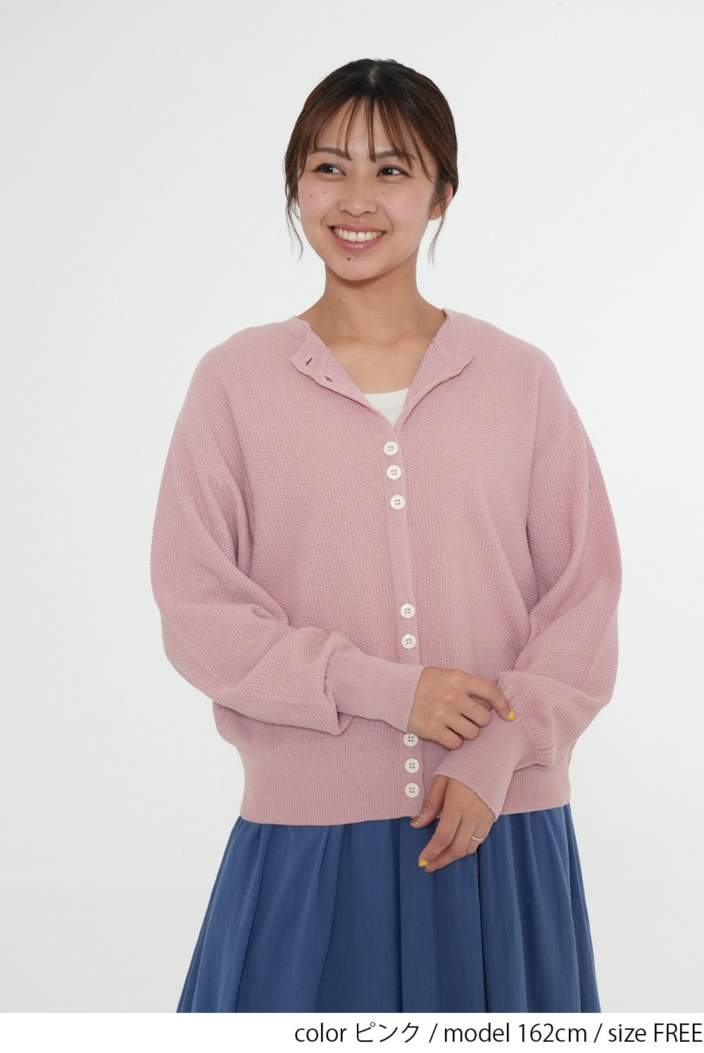 凹凸のあるカノコ編みで、表情豊かに仕上げたクルーネックカーディガン。